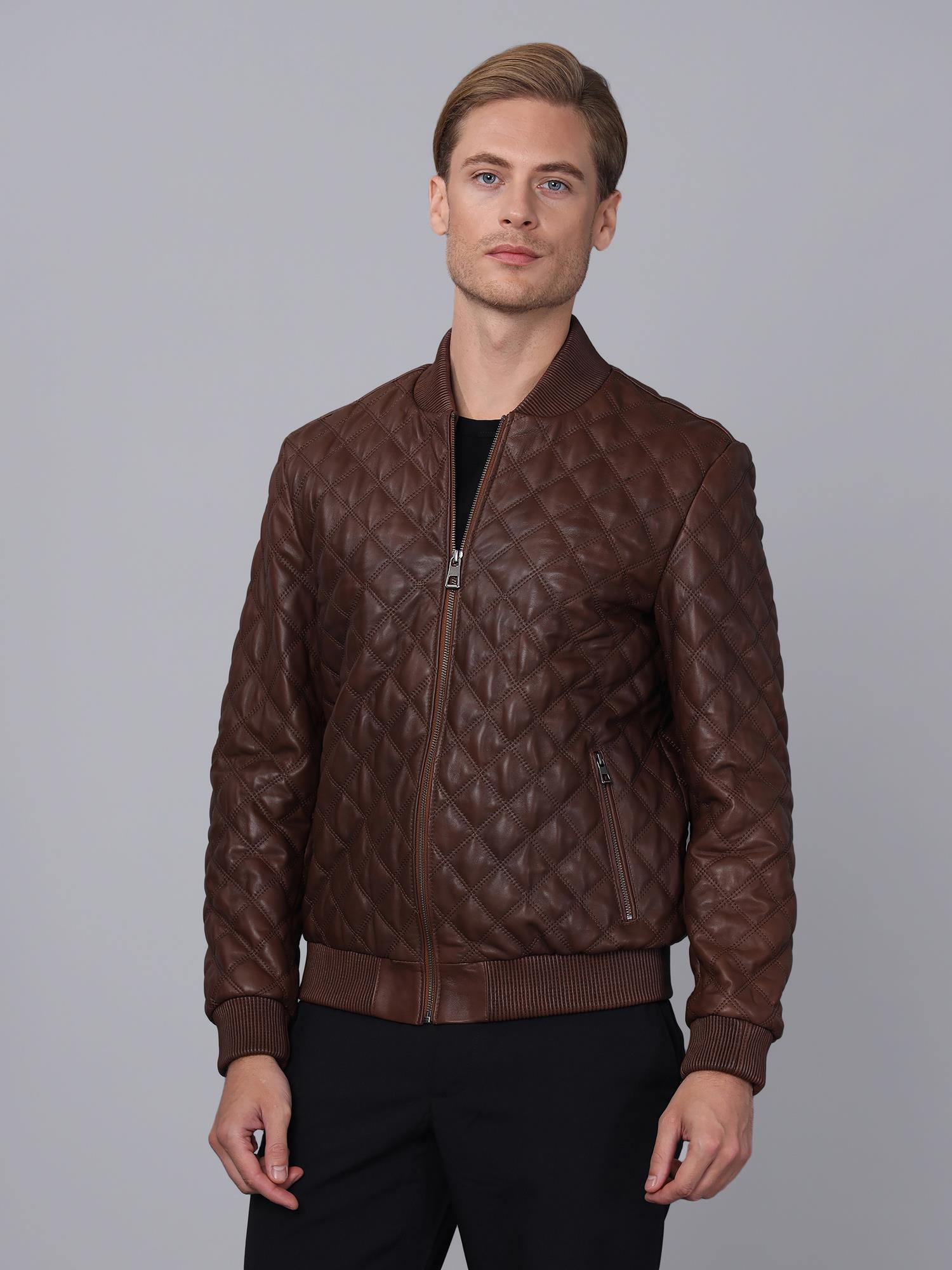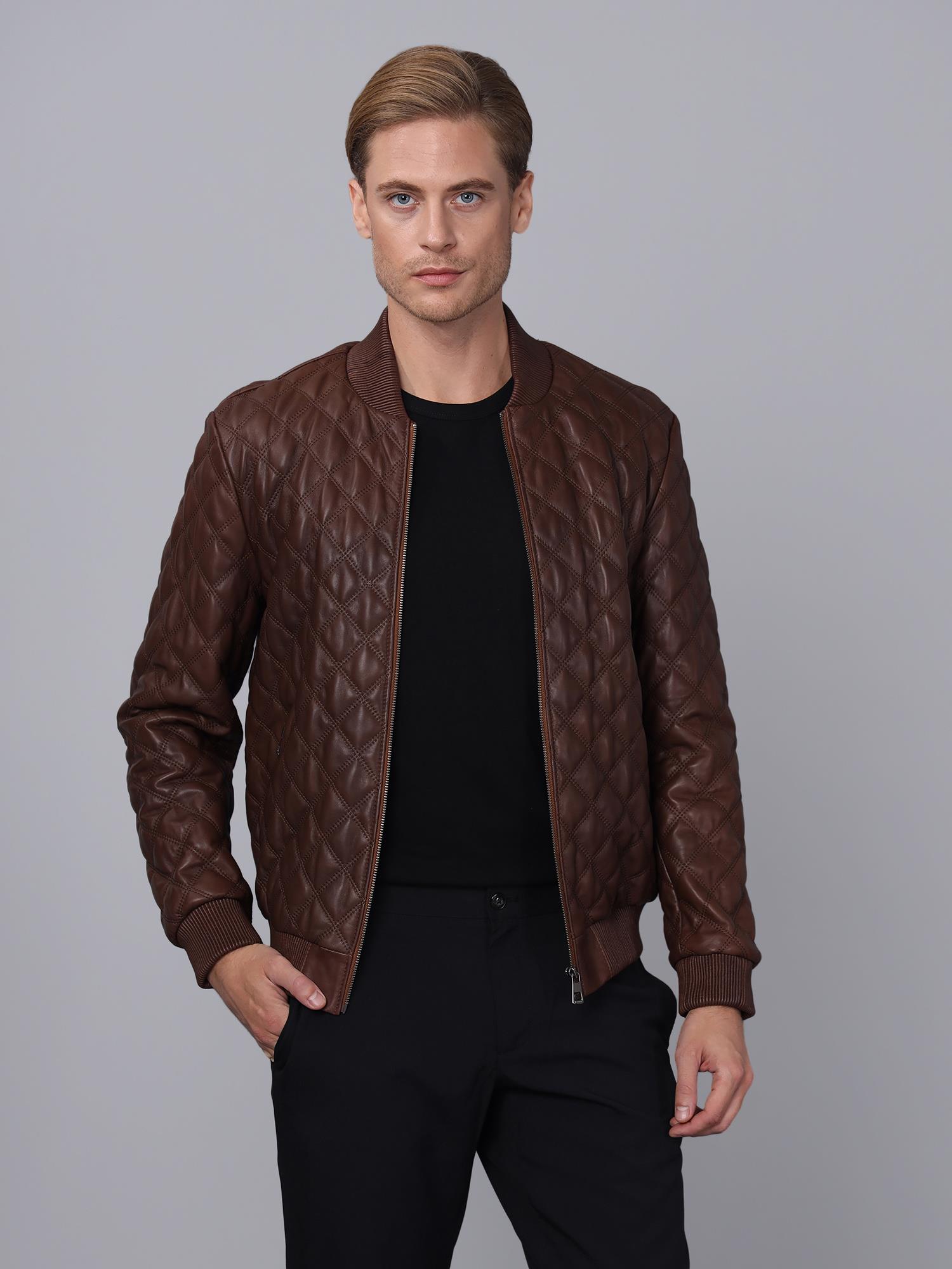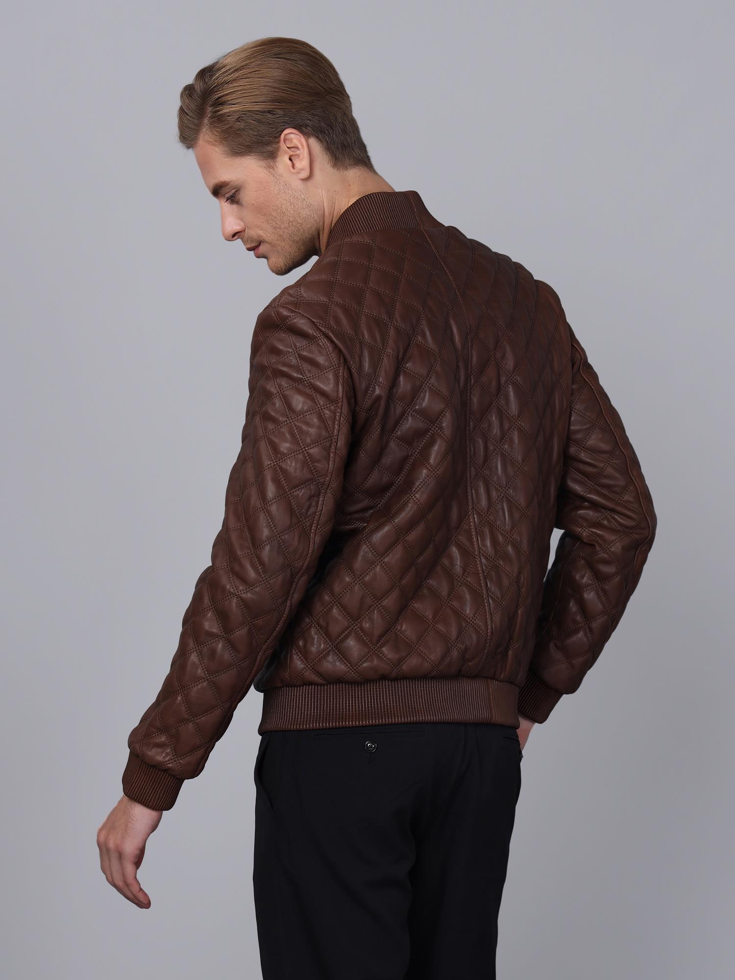 Basics&More Erkek Kapitone Kestane Deri Ceket - E10031