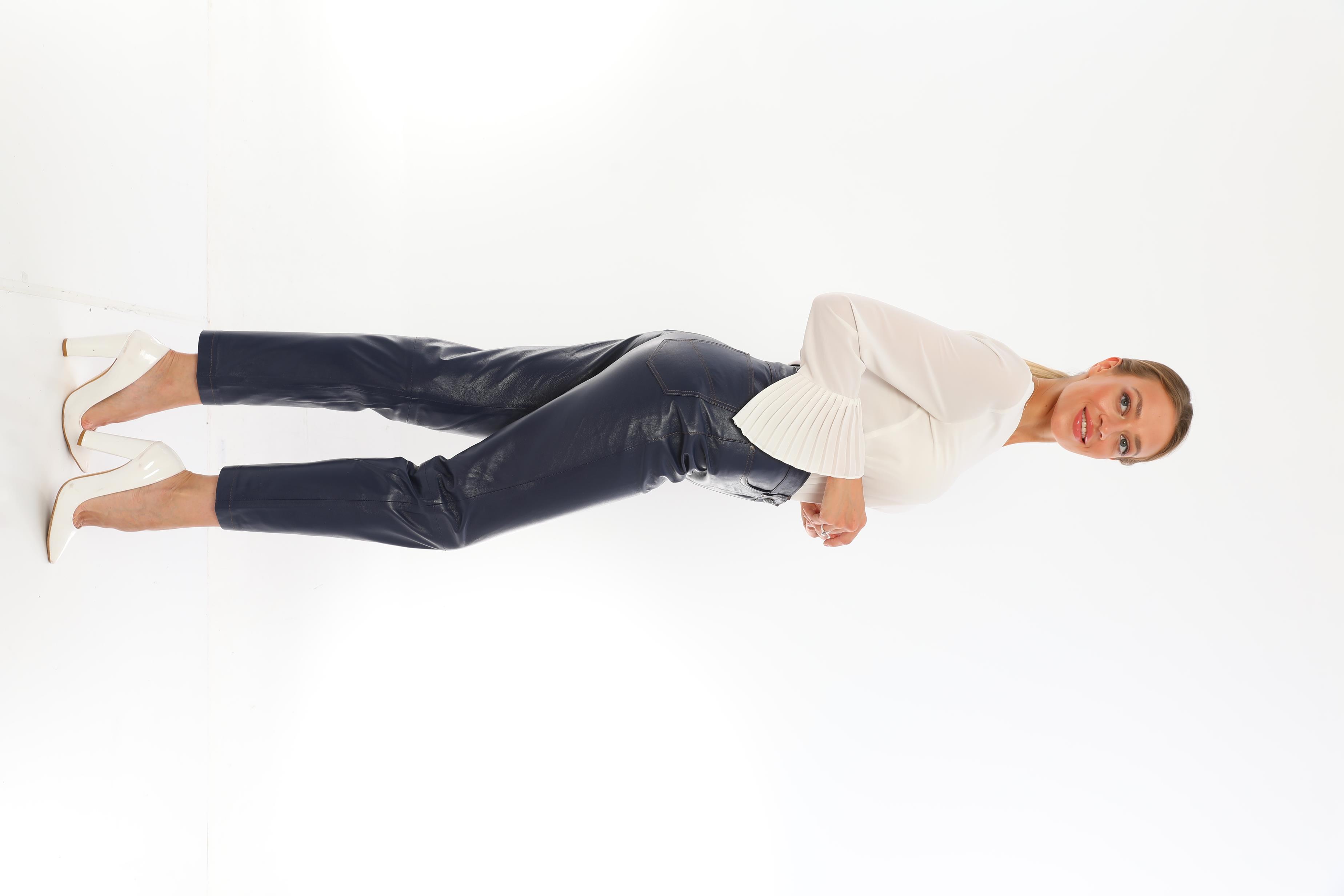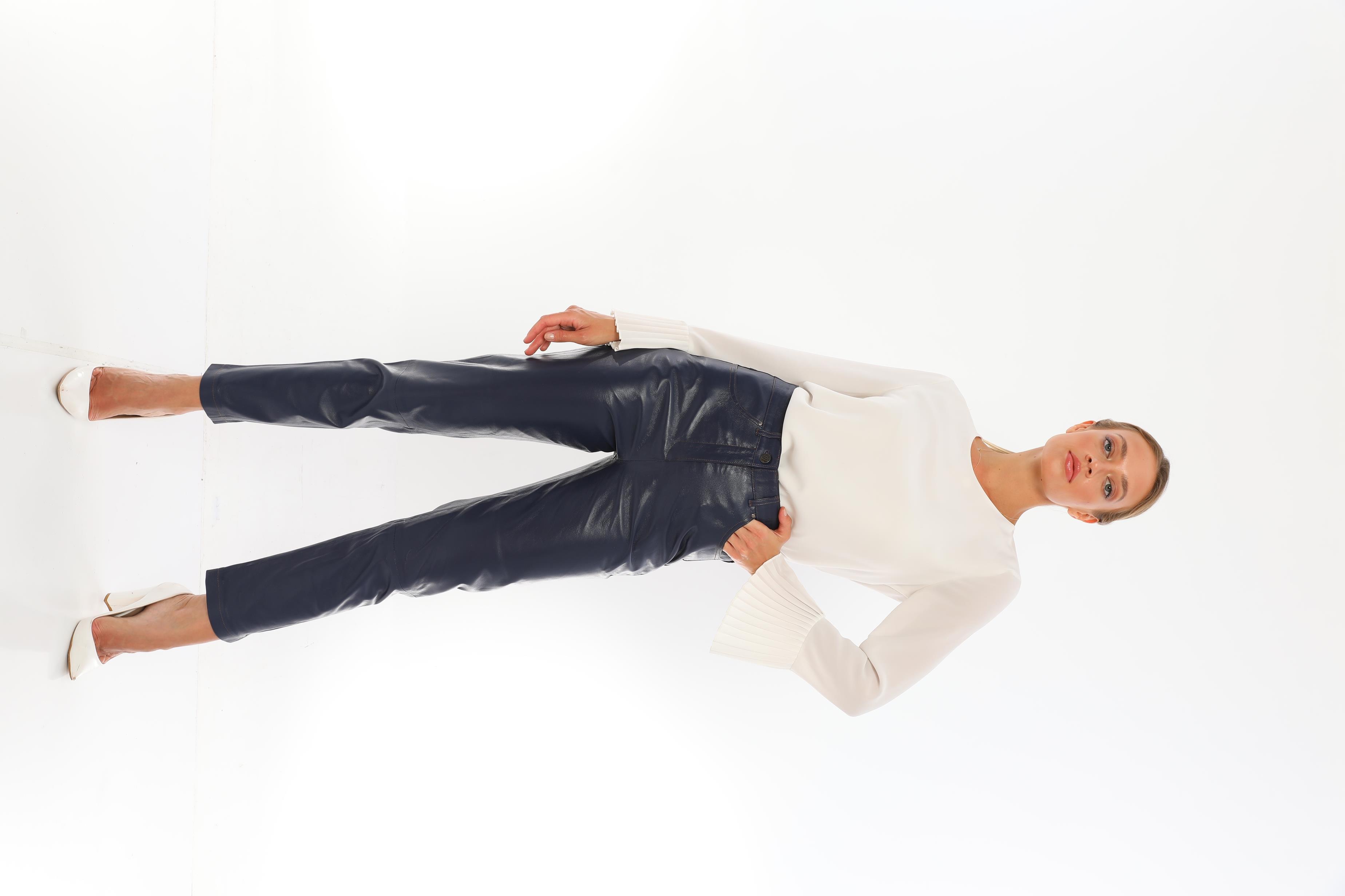 Bu deri pantolonu beyaz gömlek ve stiletto ayakkabılarla kombinleyerek klasik ve şık bir görünüm elde edebilirsiniz. Daha rahat bir tarz için oversize bir kazak ve botlarla tamamlayabilirsiniz.
