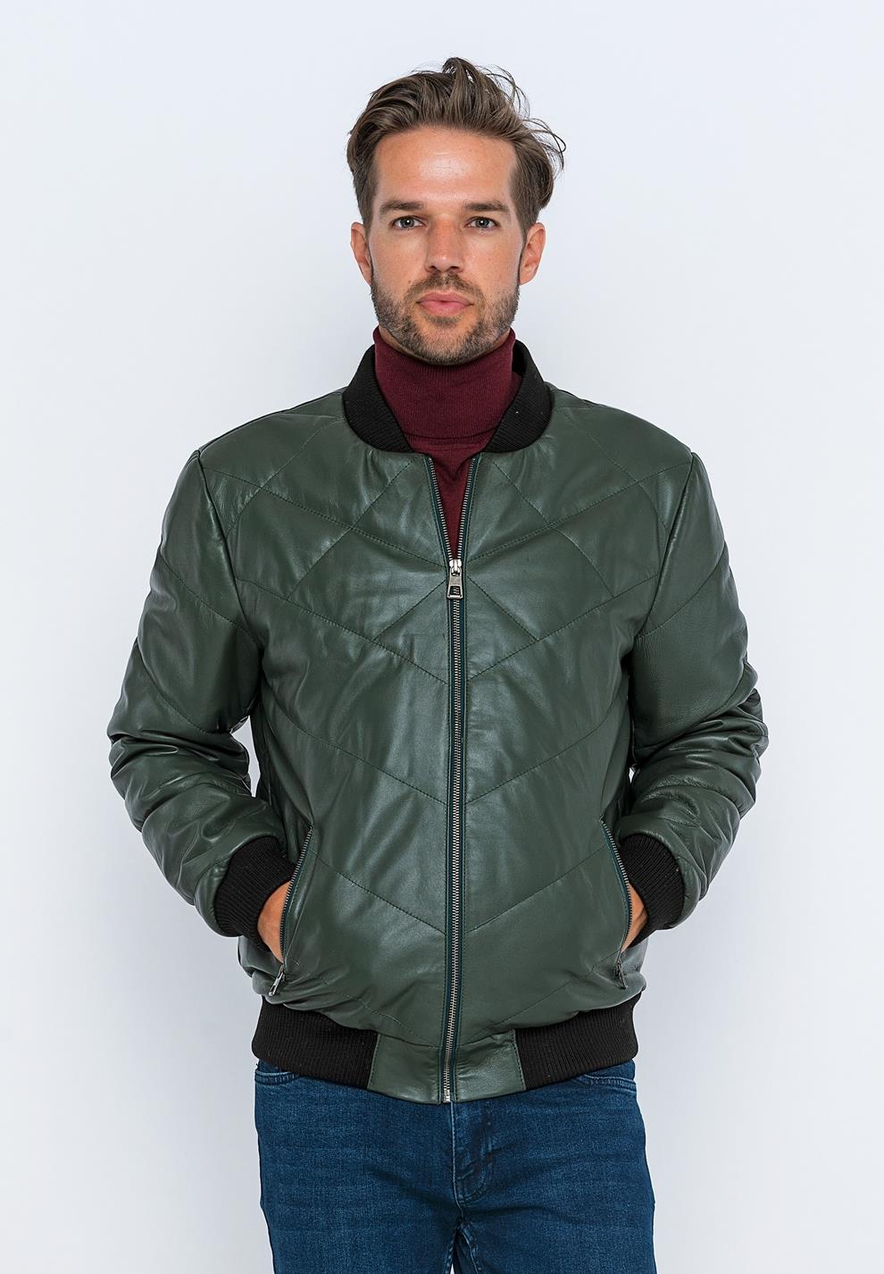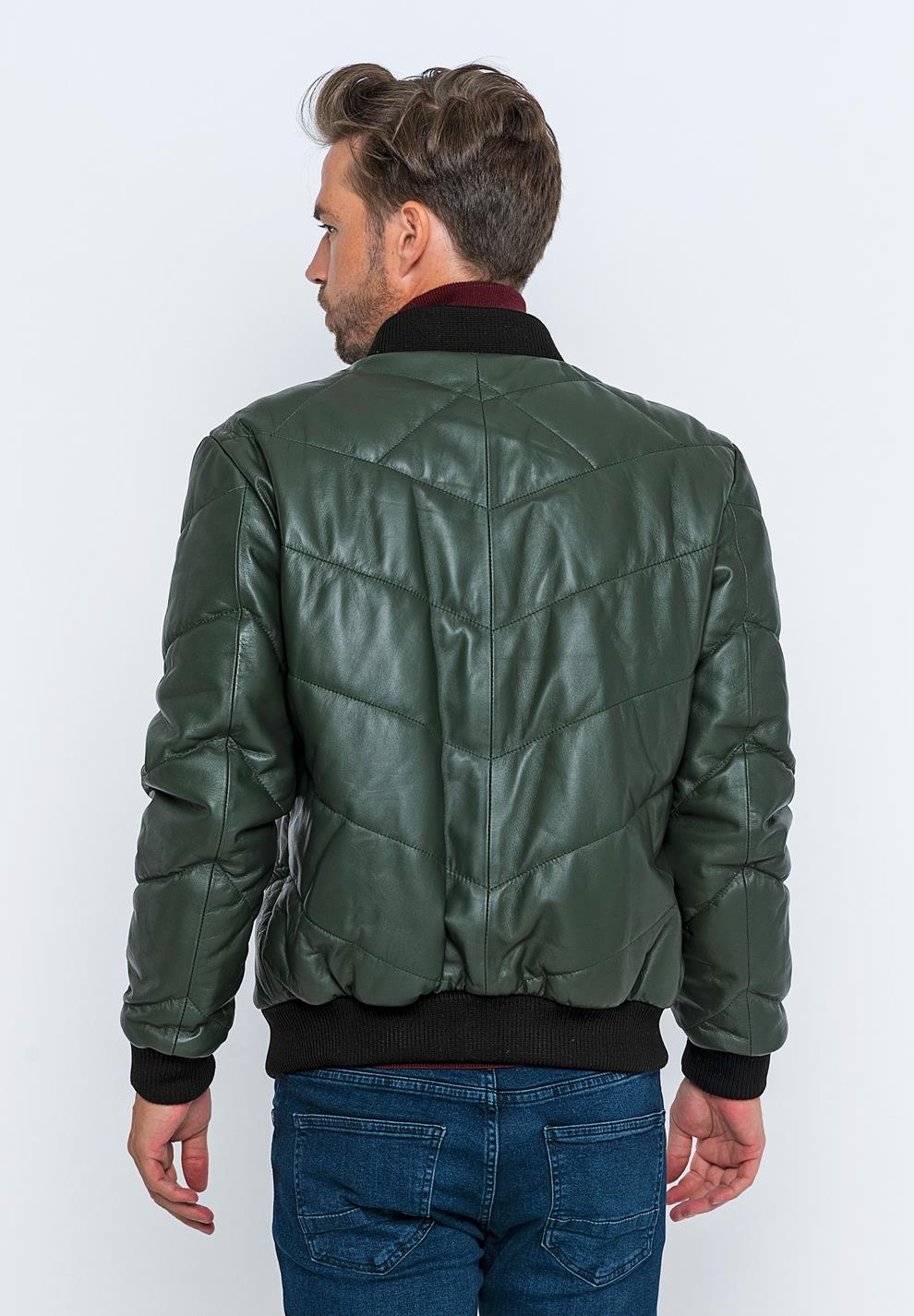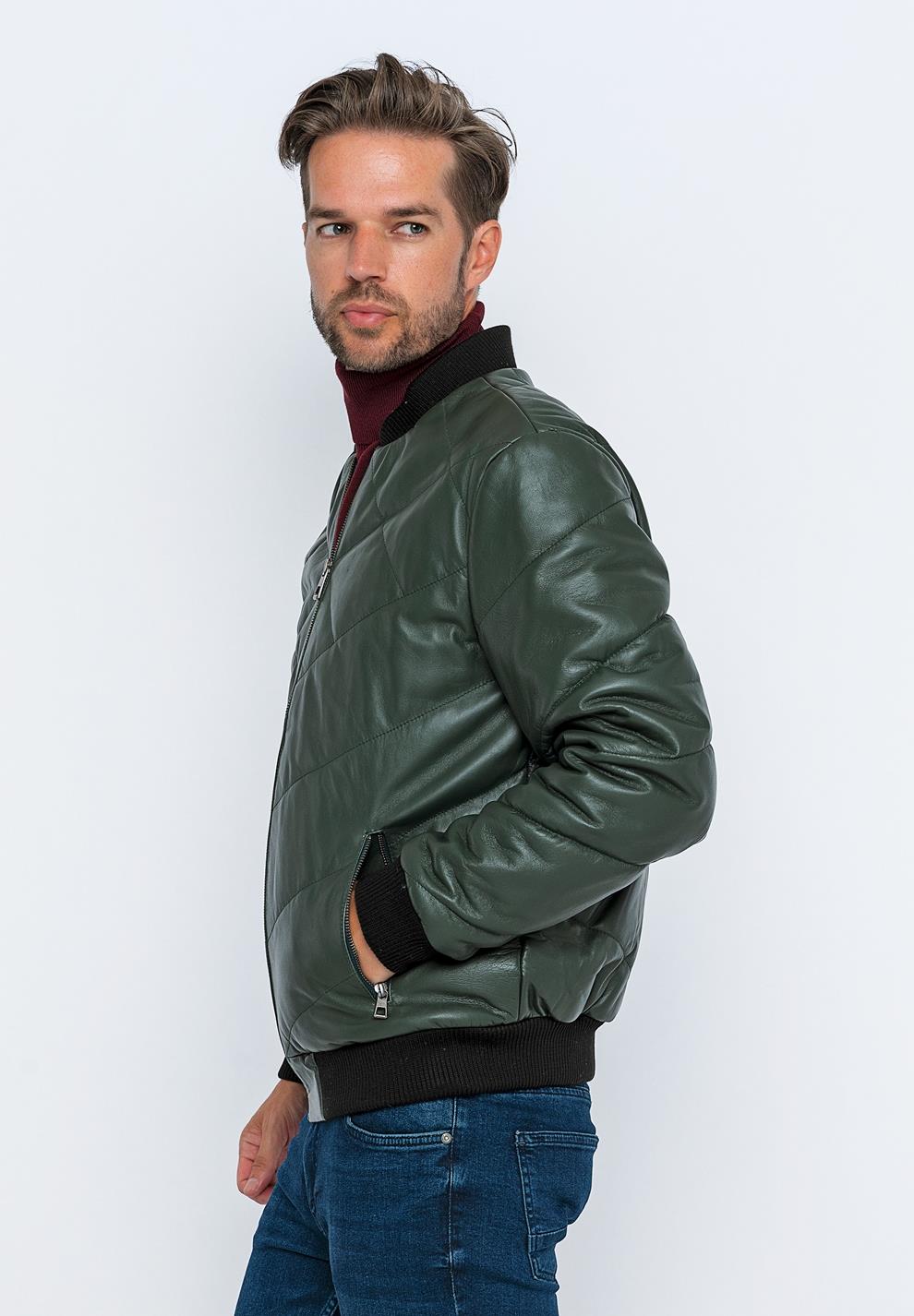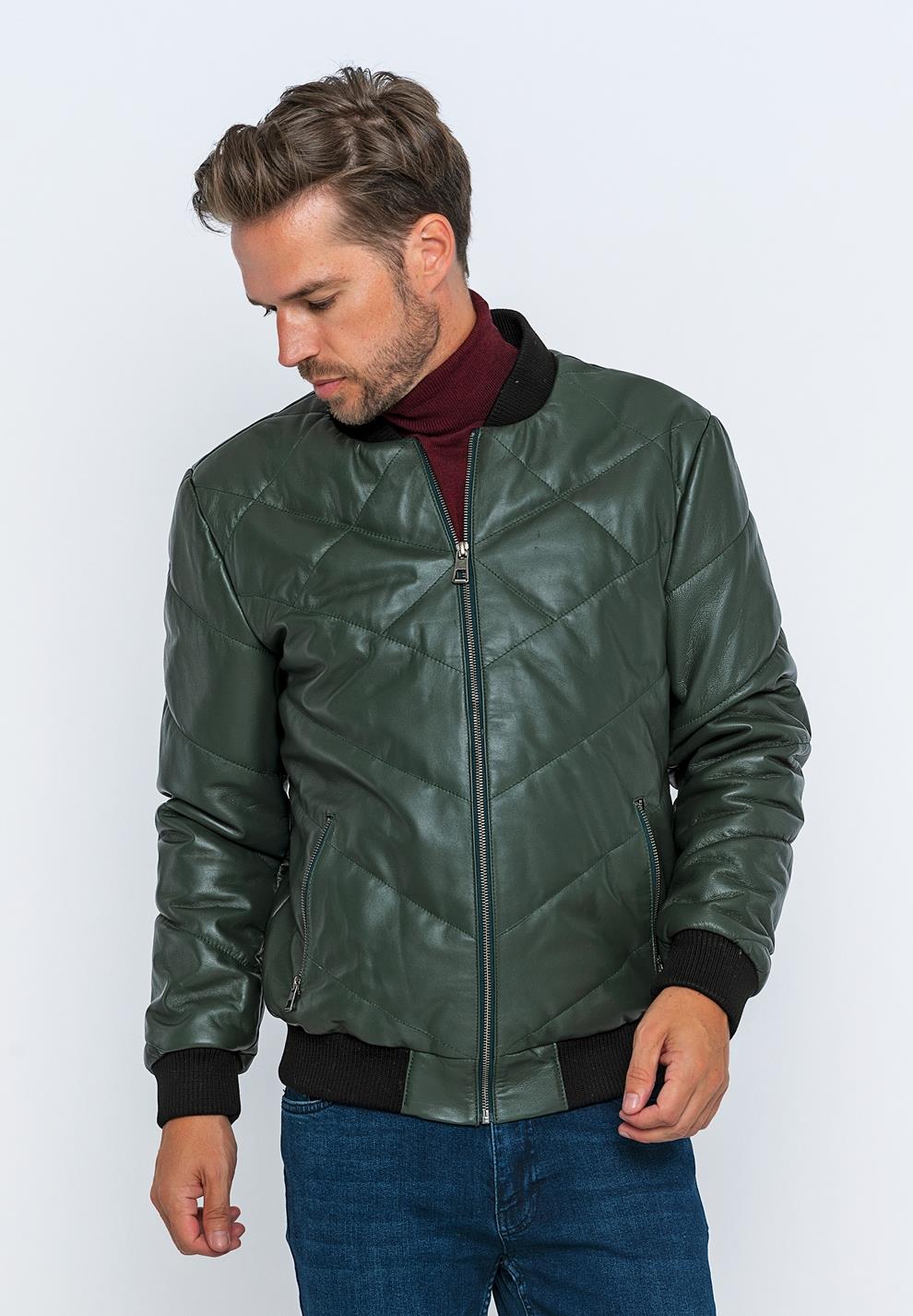 Erkekler için Modern ve Şık Tasarımlı Koyu Yeşil Kapitone Desenli Deri Bomber Ceket – Rahat ve Tarz Görünüm