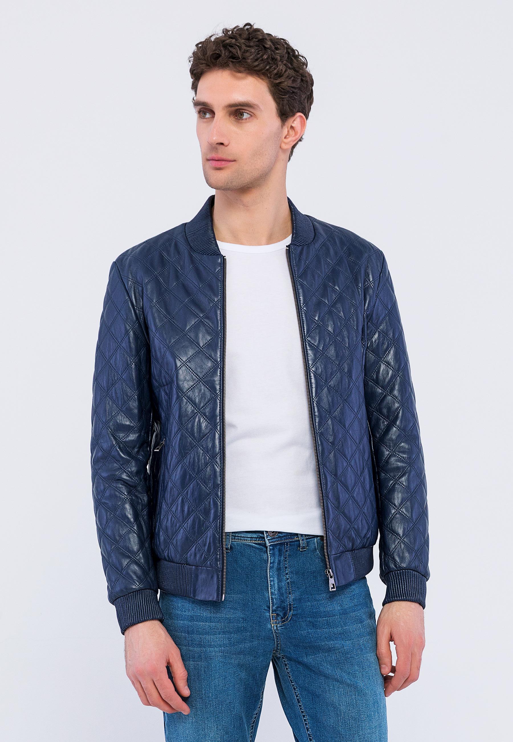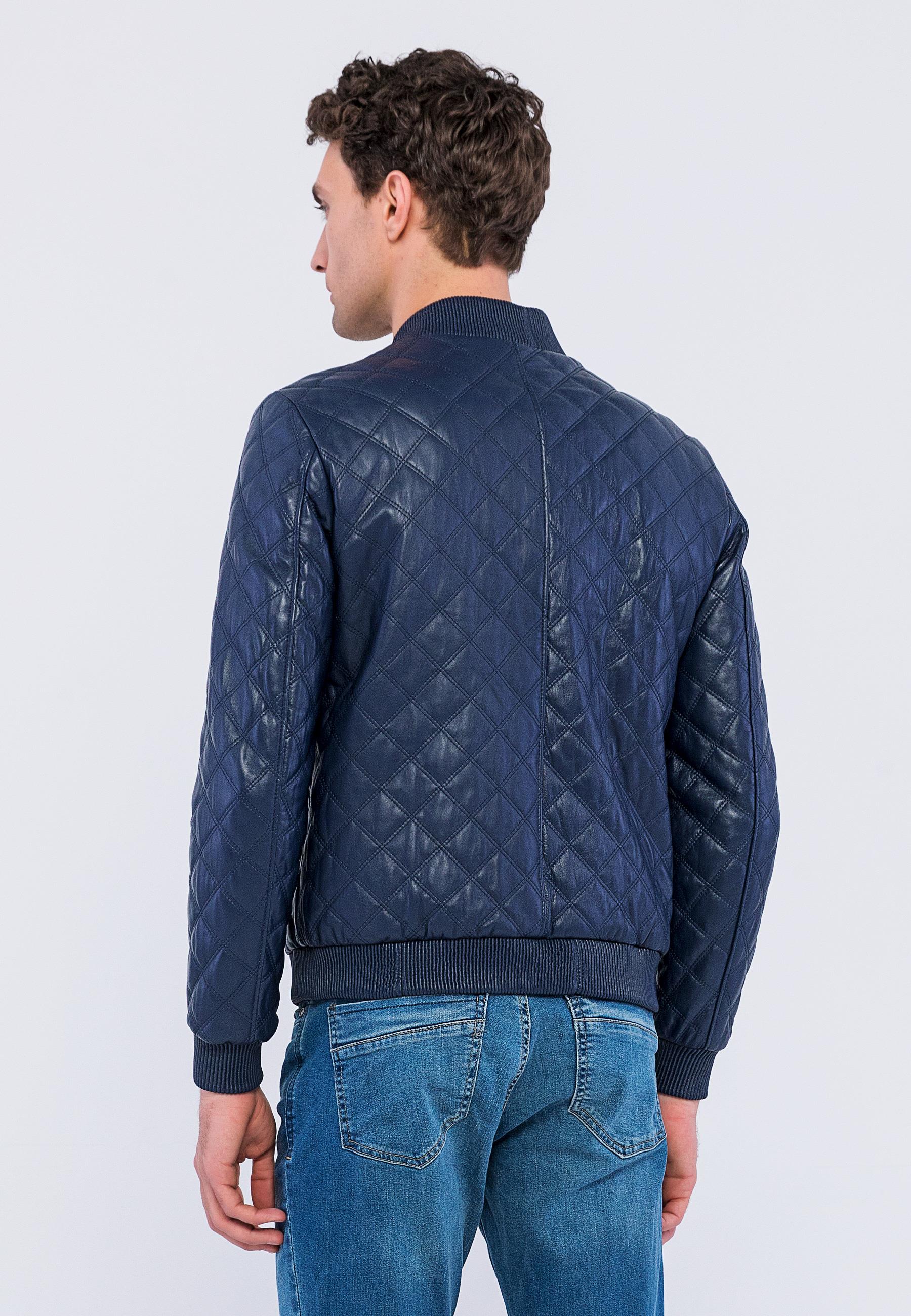 Basics&More Erkek Kapitone Koyu Mavi Deri Ceket - E10031