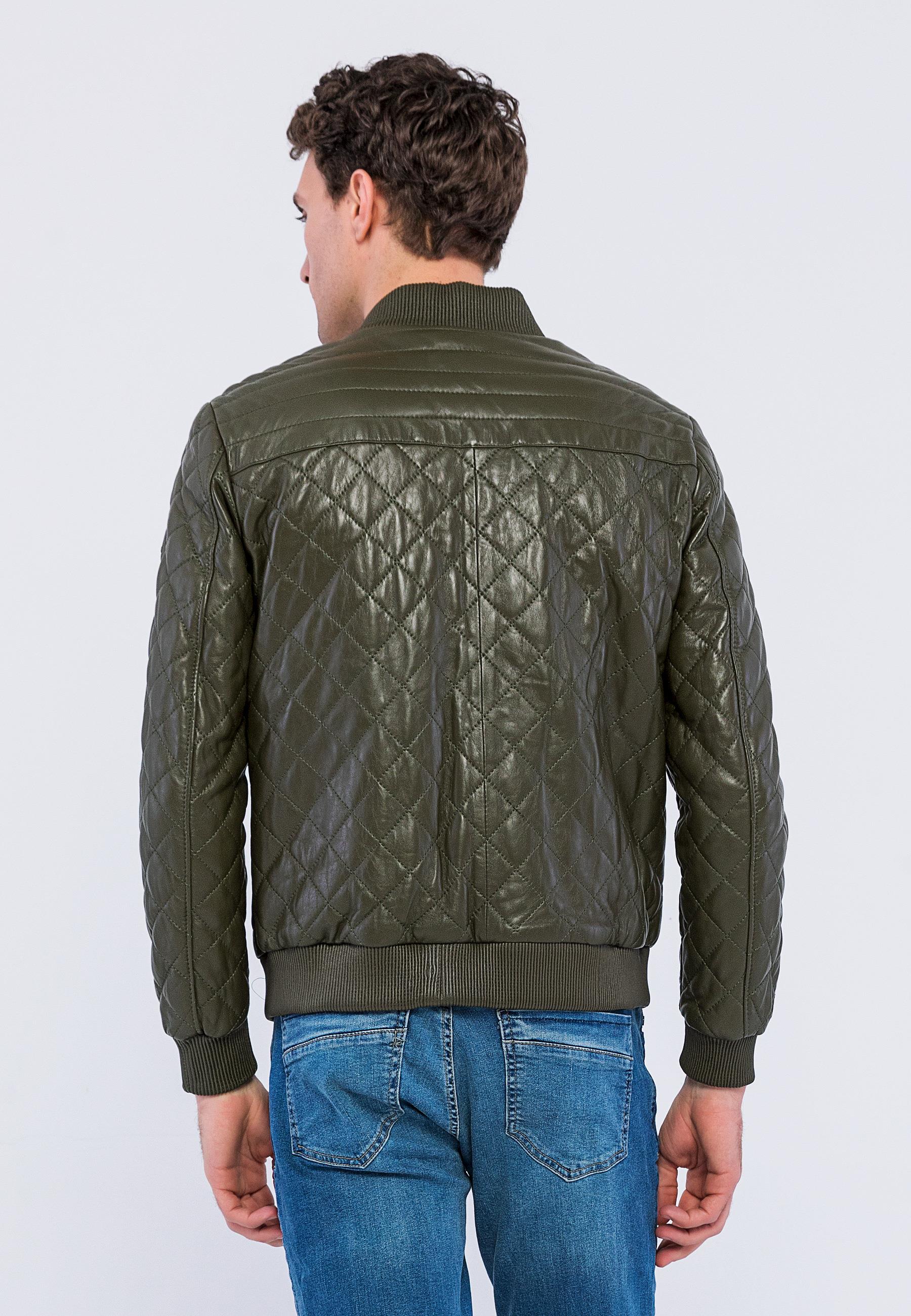 Basics&More Erkek Kapitoneli Haki Hakiki Deri Ceket - YNS45