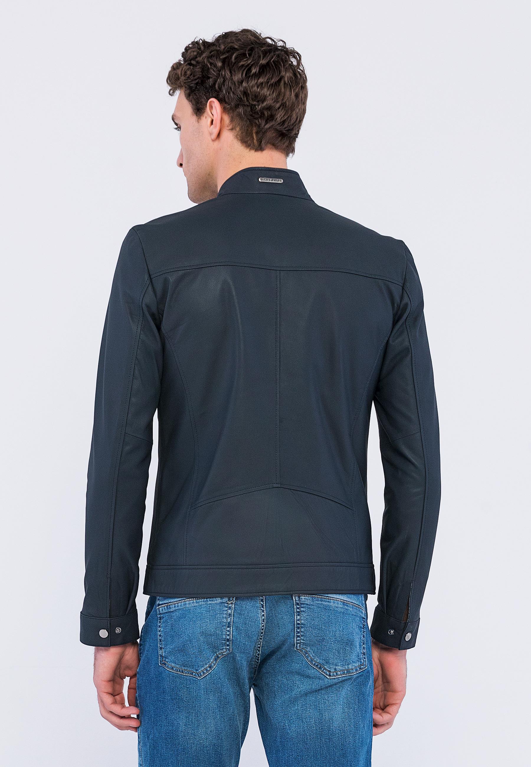 Klasik ve zamansız tasarımıyla dikkat çeken lacivert deri ceket, her gardıropta yerini alacak zarif bir parça.;