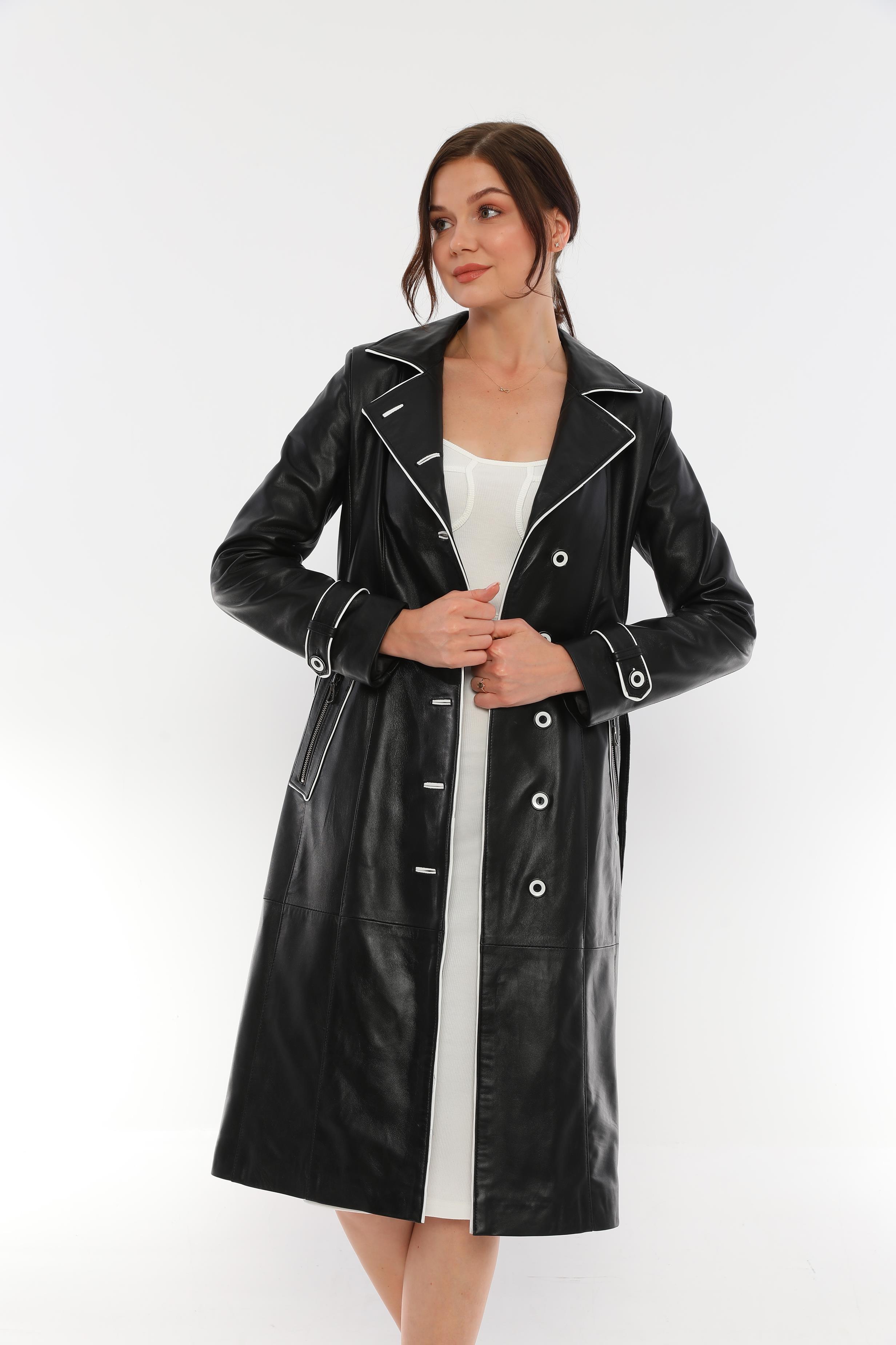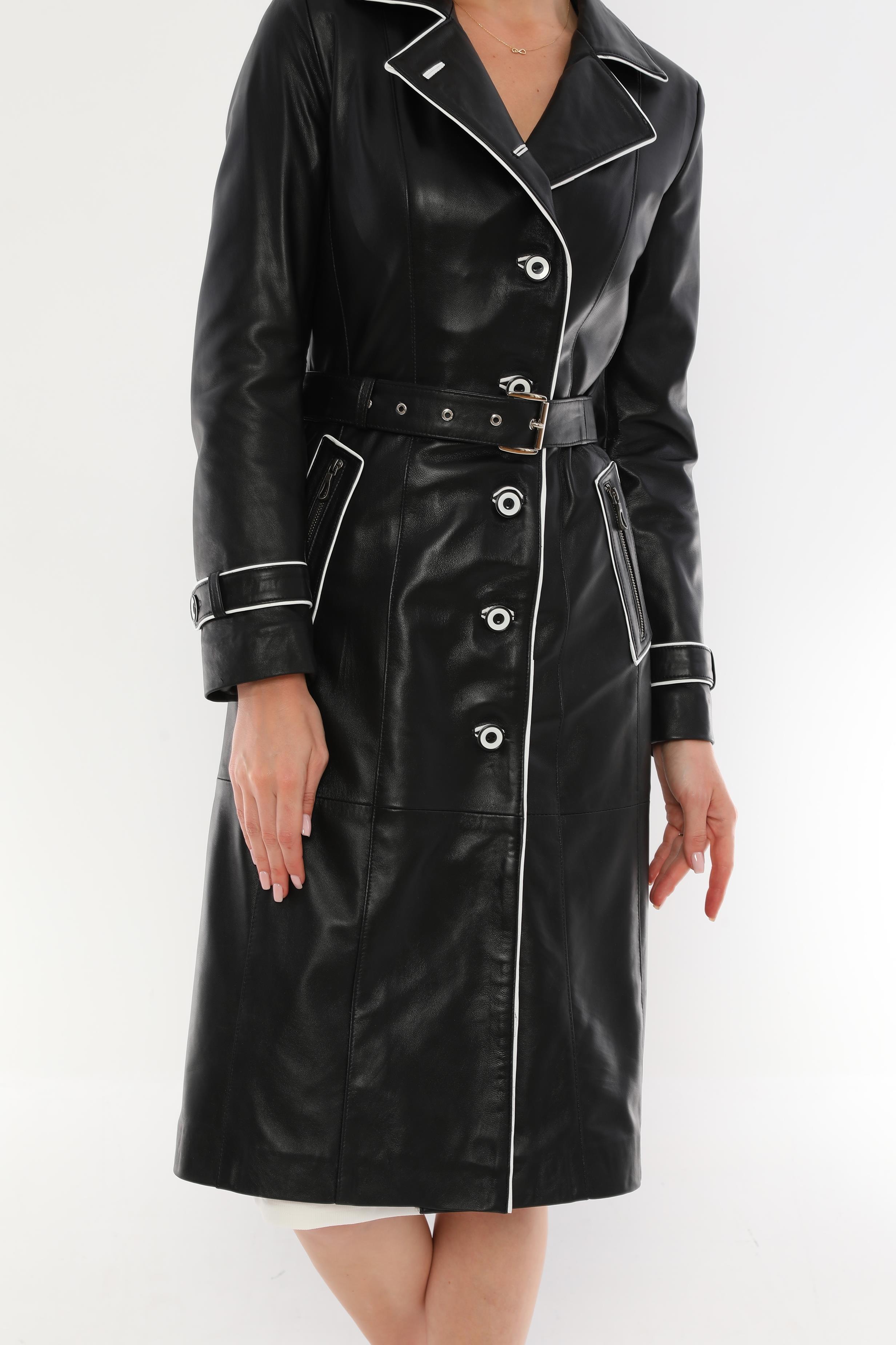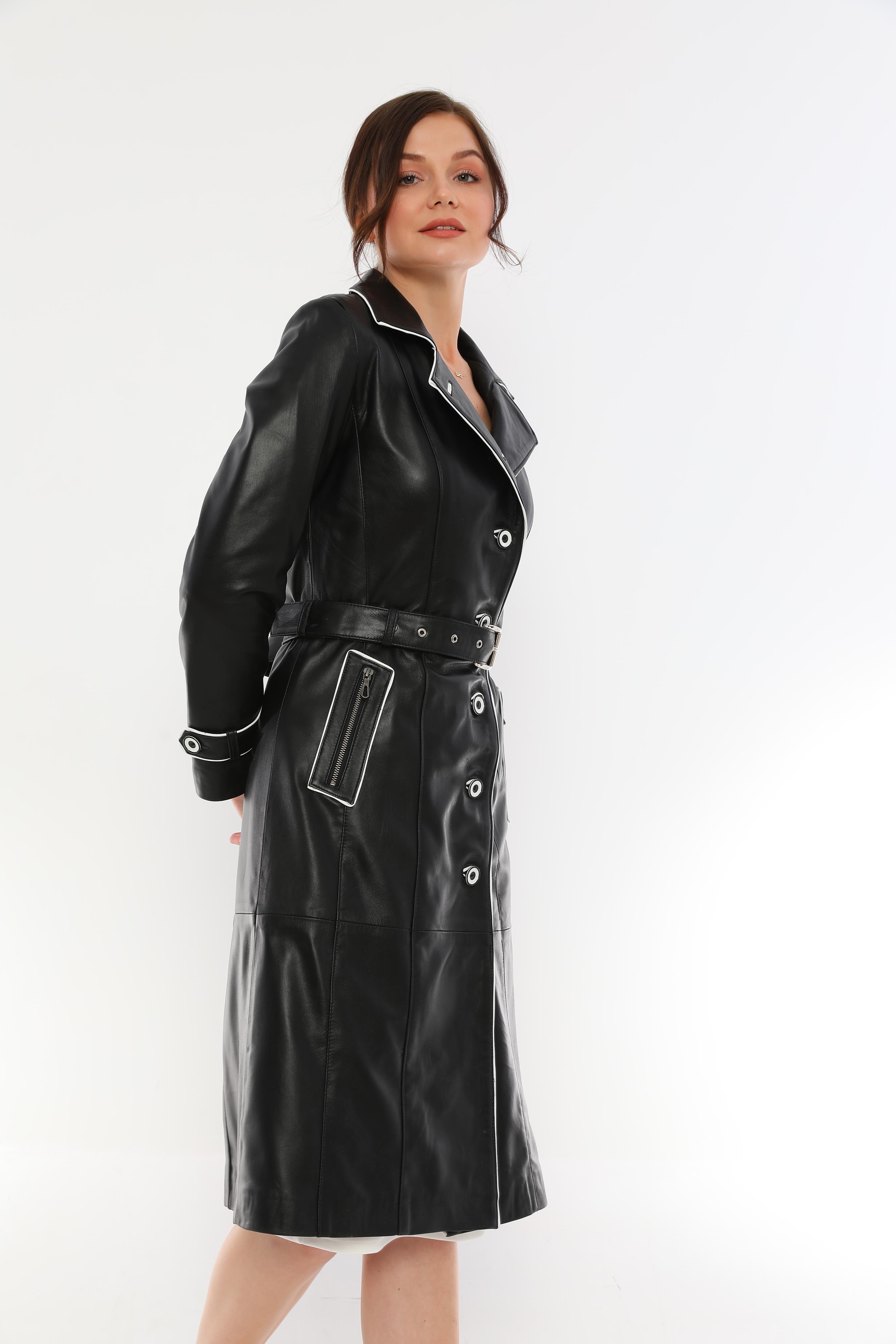 Basics&More Kadın Beyaz Biyeli Siyah Deri Ceket – Şık ve Zarif Tasarım