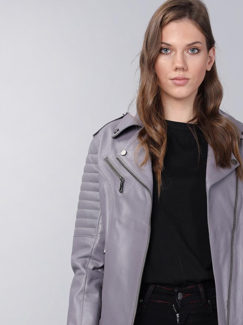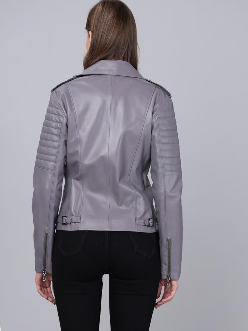 Basics&More Kadın Biker Gri Deri Ceket - BM02