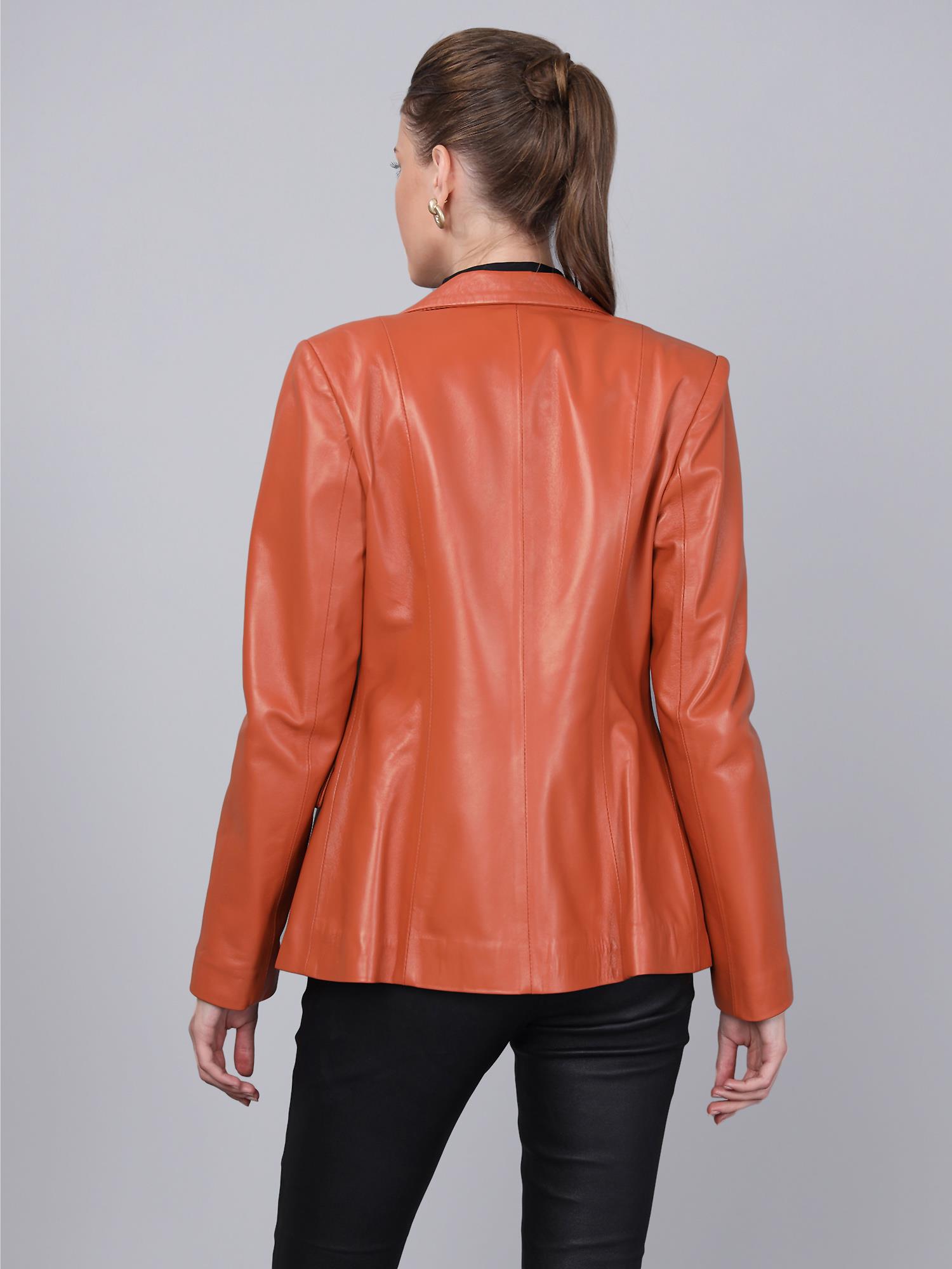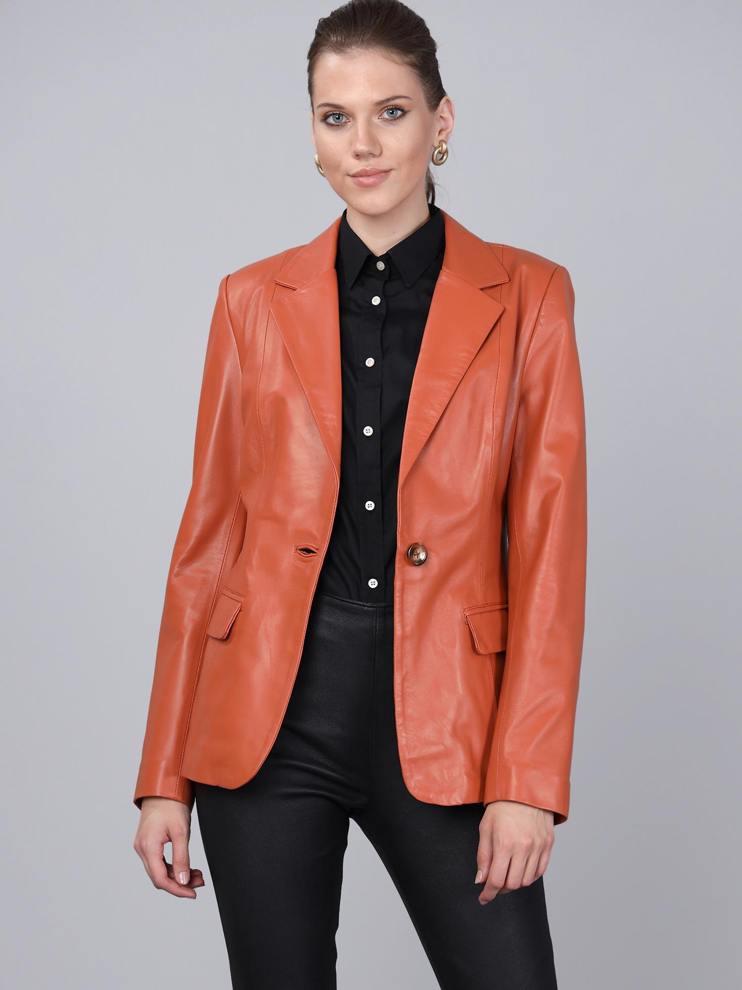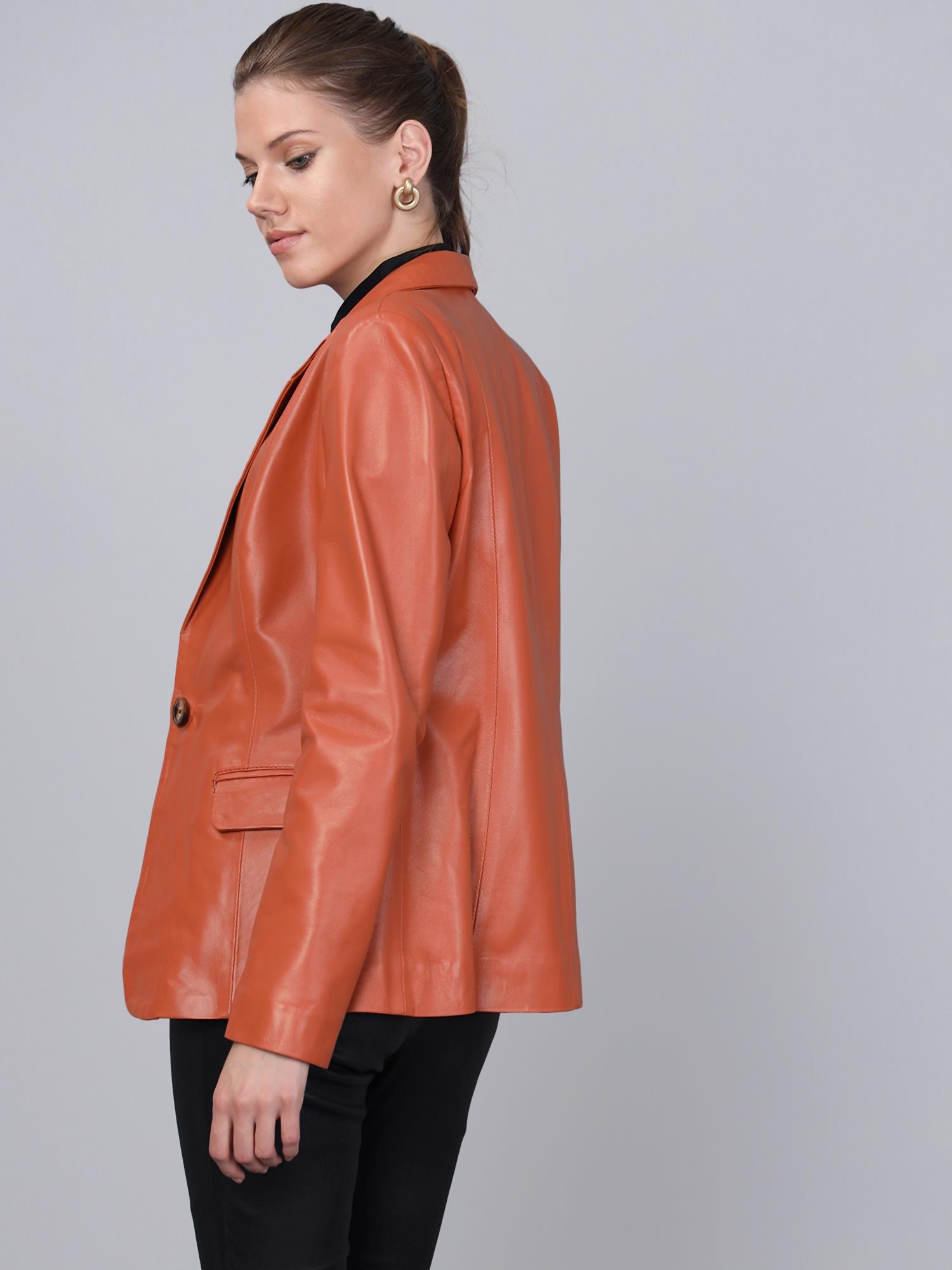 Orta boy kesimi ile her vücut tipine uyum sağlayan kadın turuncu ceket, rahat ve şık bir görünüm sunar;
