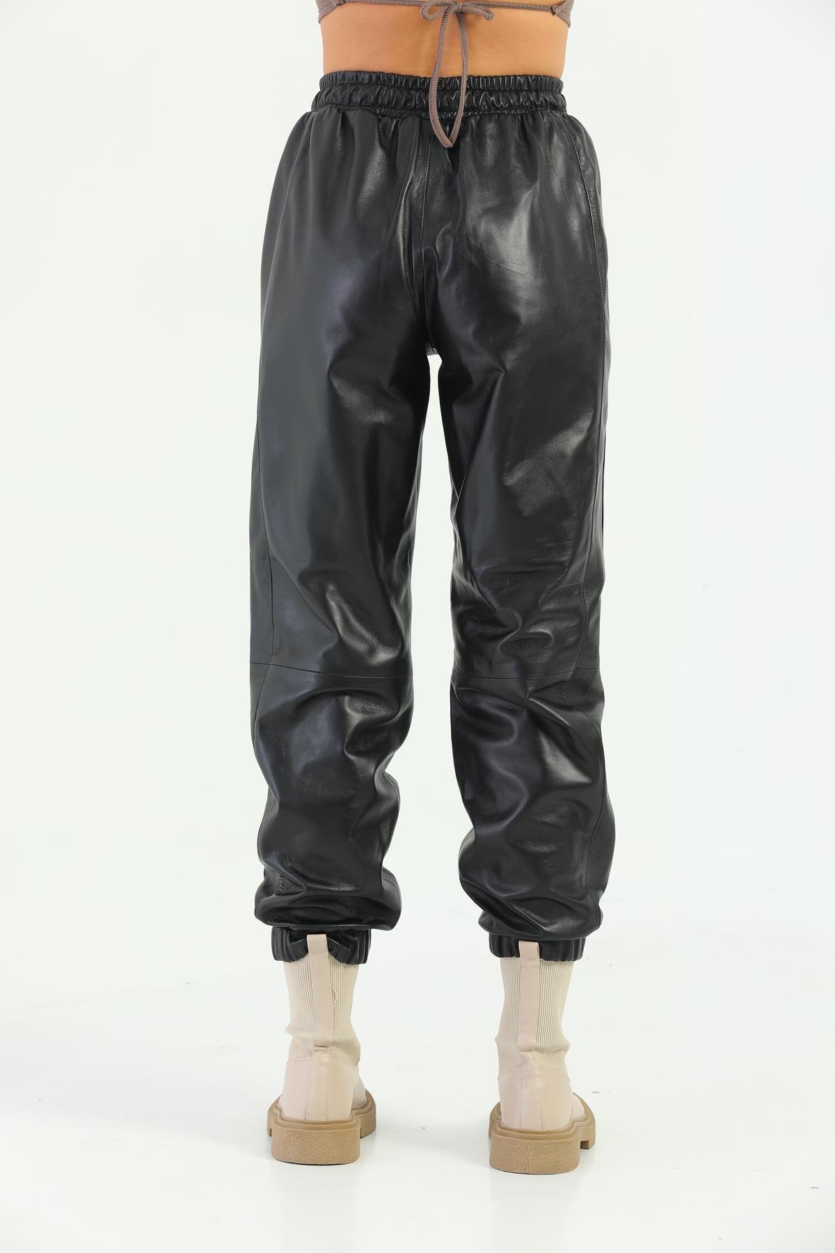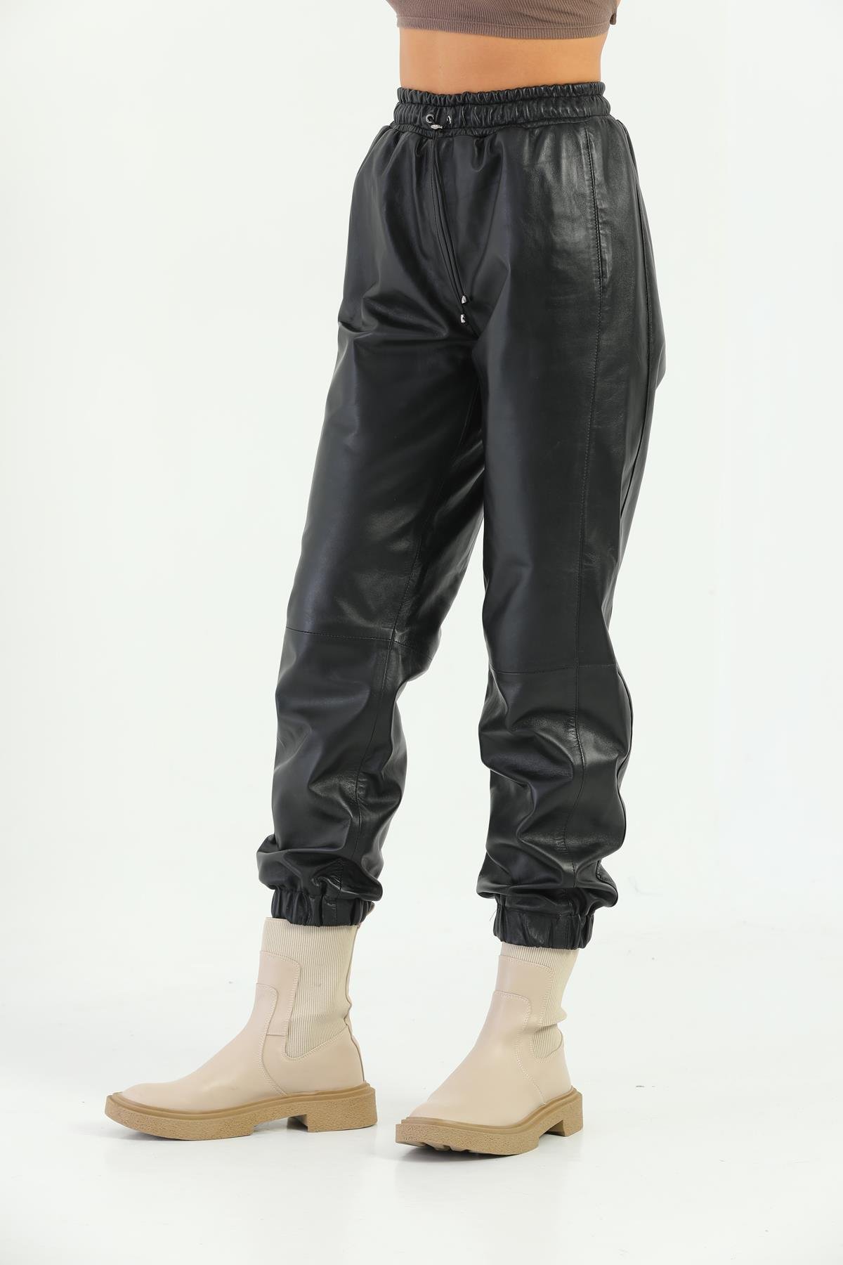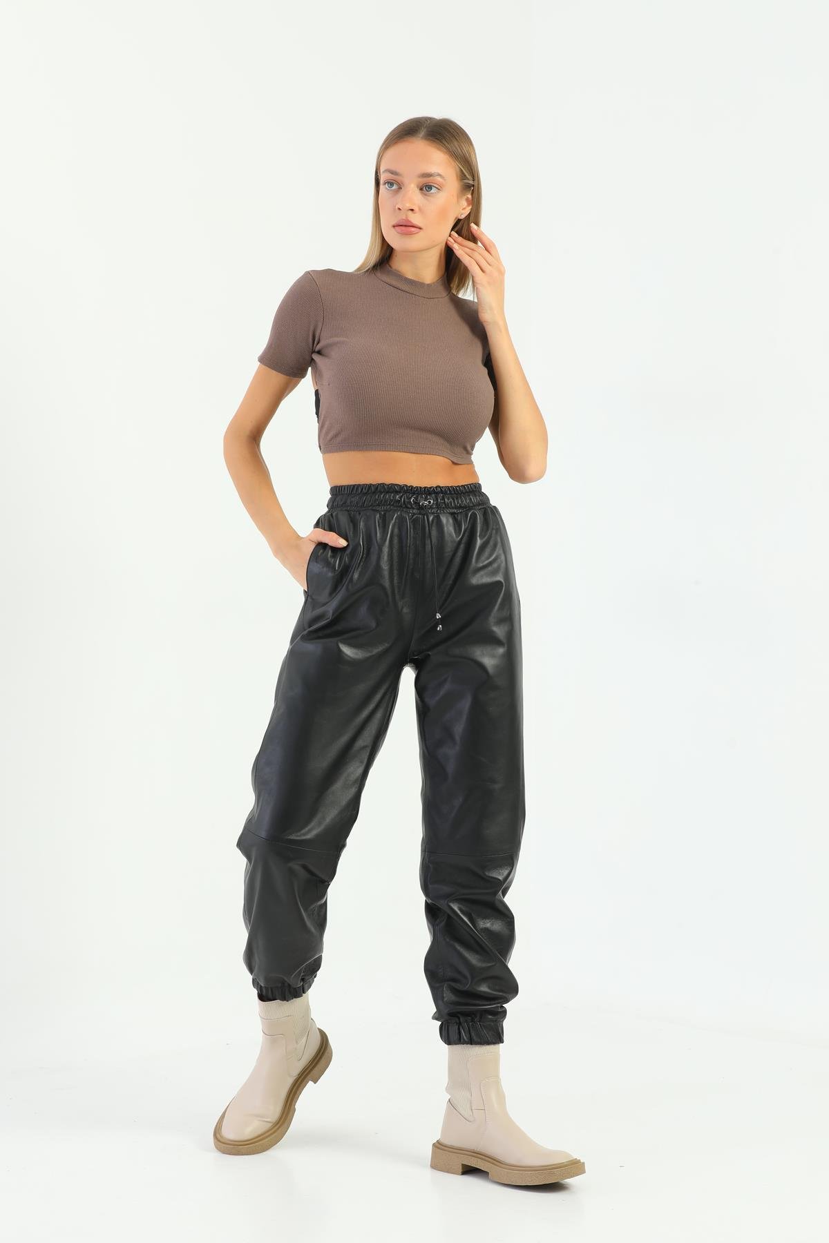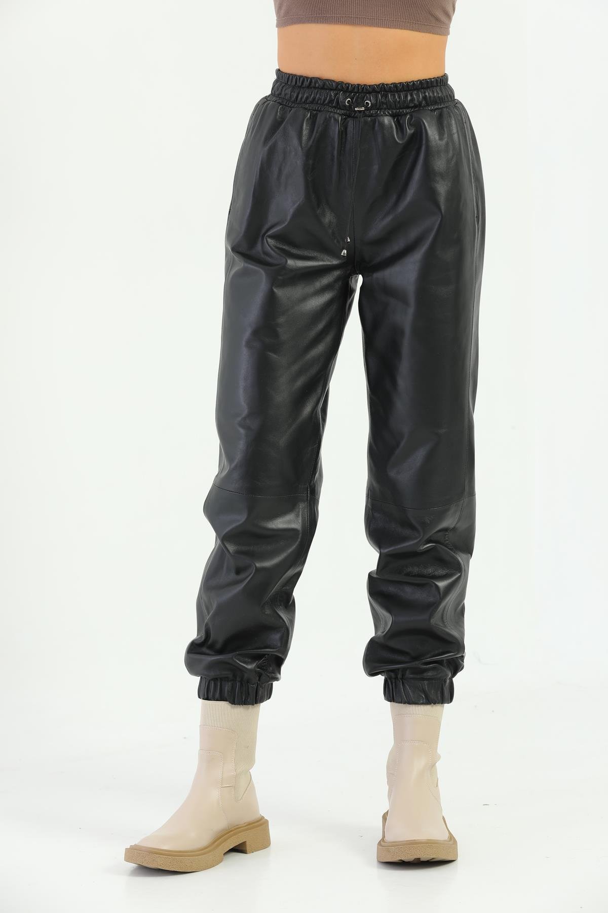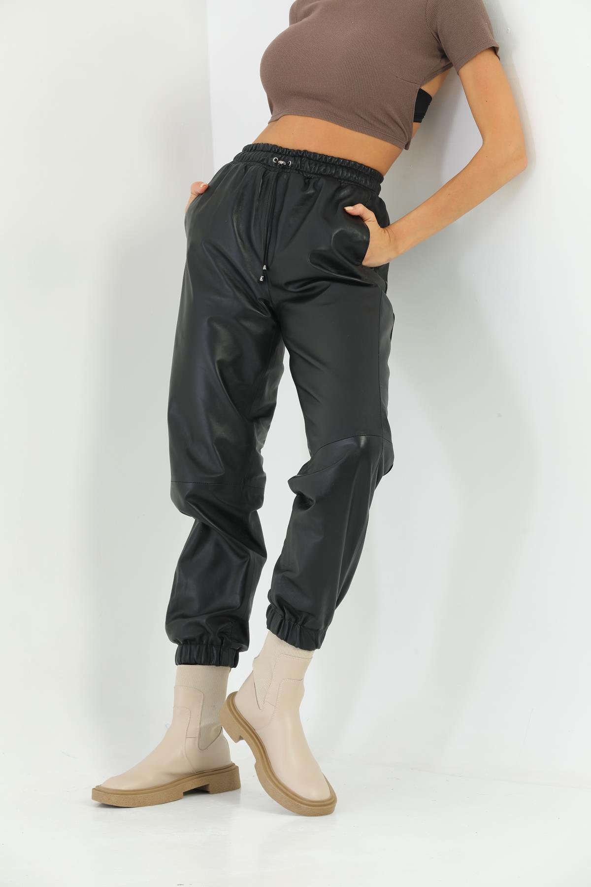 Basics&More Kadın Lastikli Yan Cepli Siyah Deri Pantolon - P04