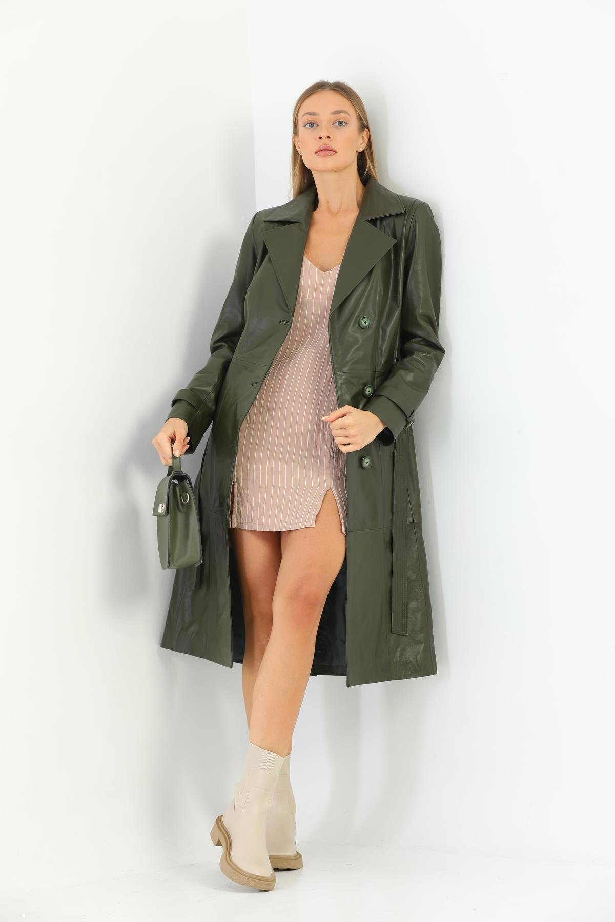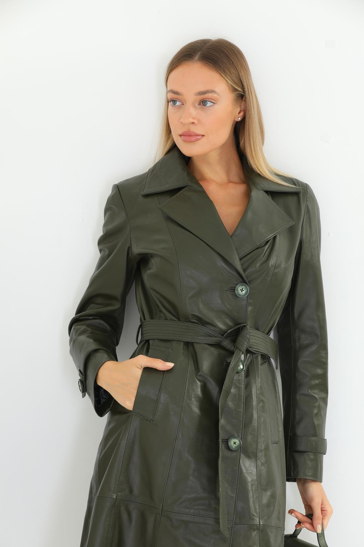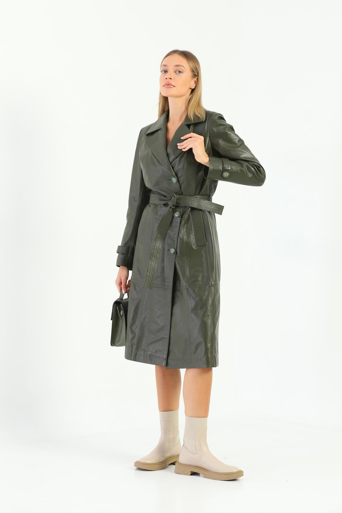 Basics&More Kadın Trenc Haki Deri Ceket - Brenda