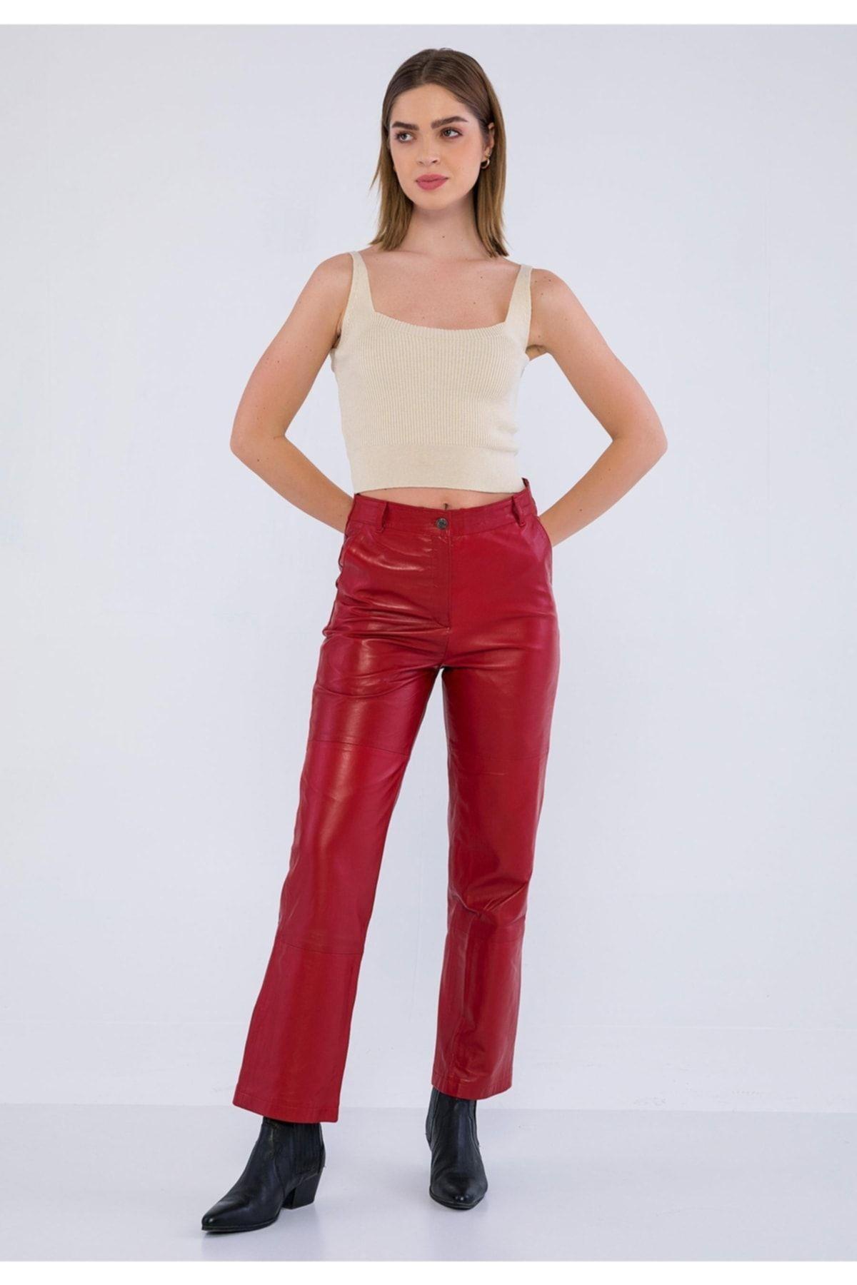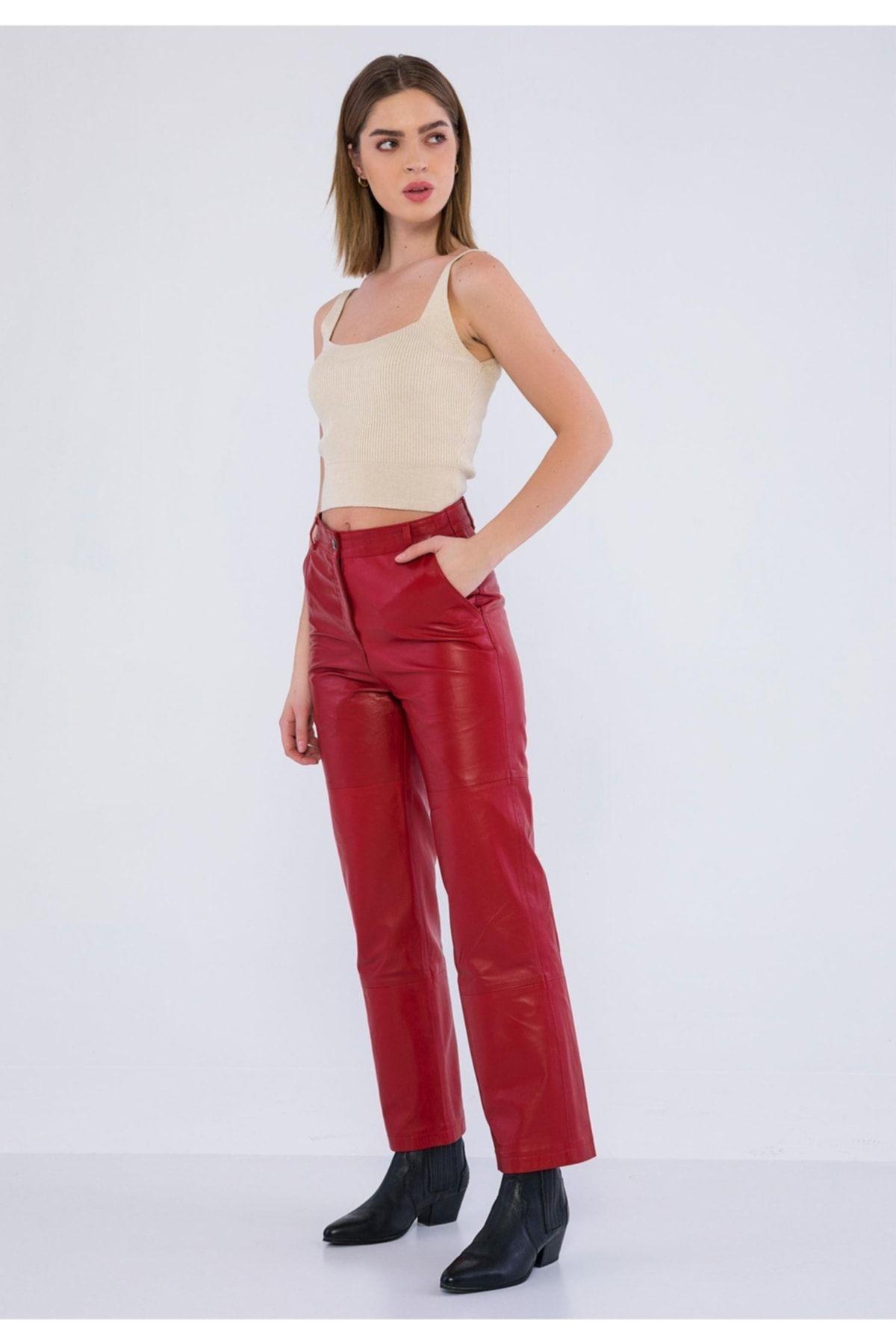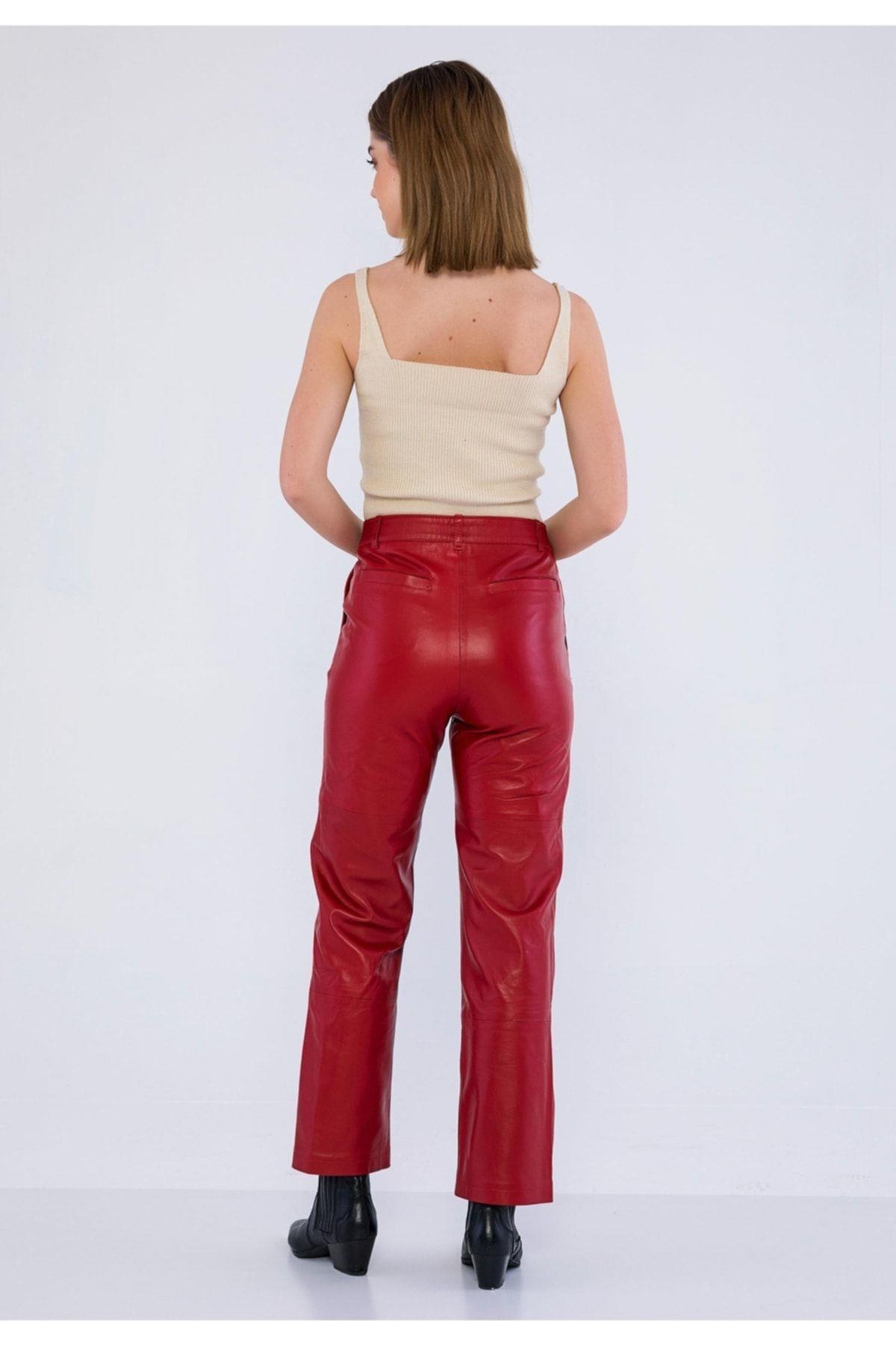 Basics&More Kadın Yandan Cepli Kırmızı Deri Pantolon - P03