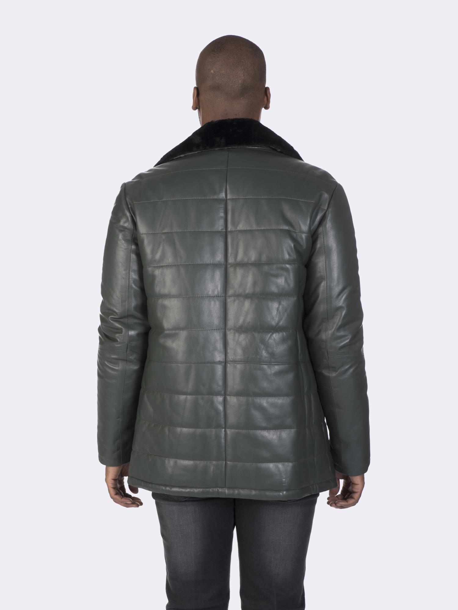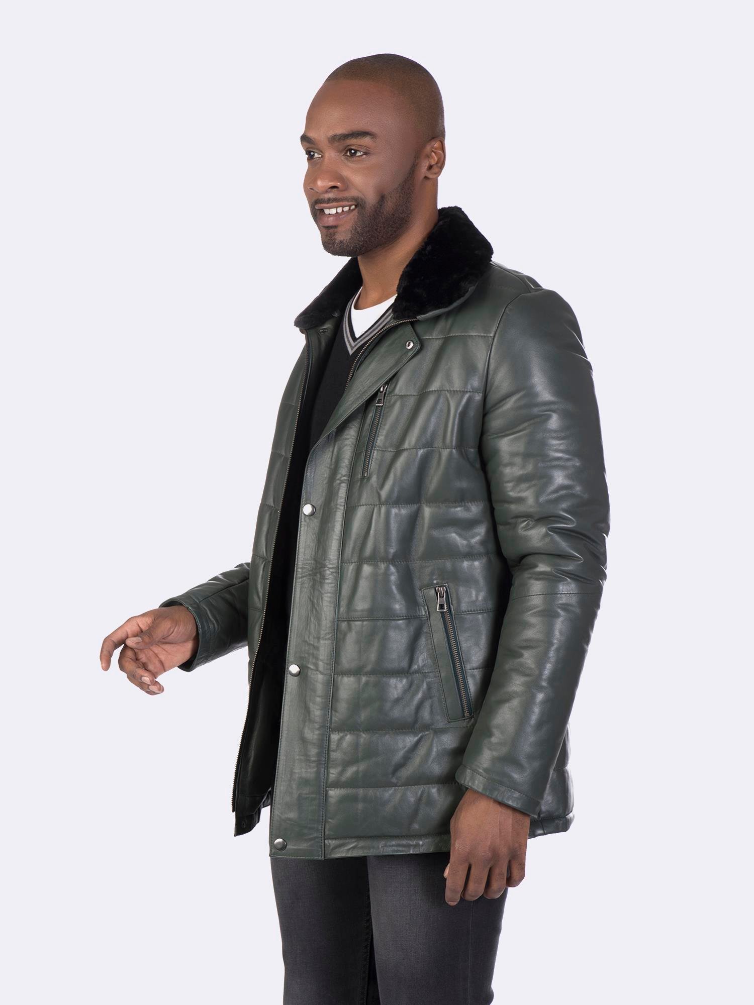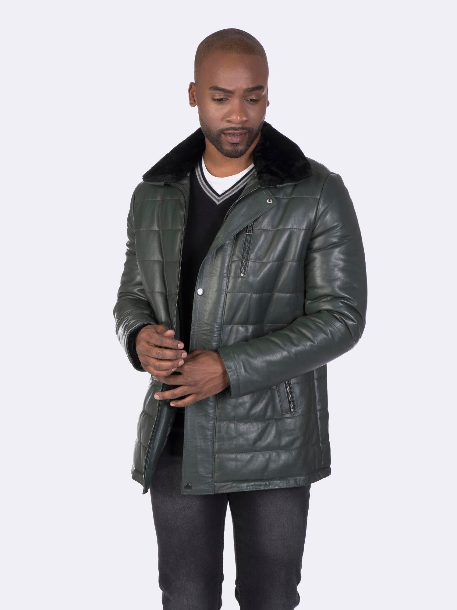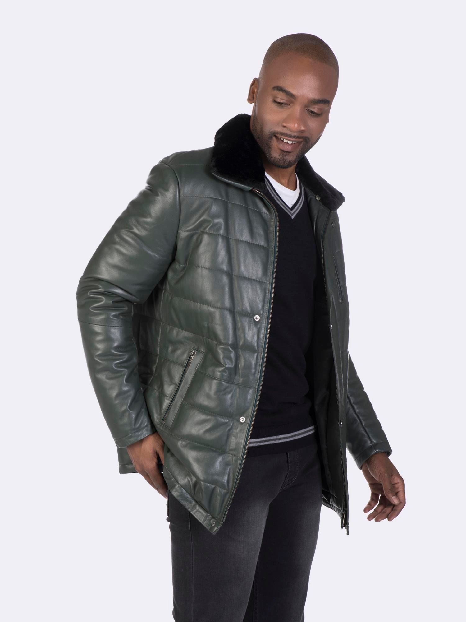 Yeşil kürk yakalı uzun deri mont, modern tasarımı ve üstün işlevselliğiyle soğuk havalarda vazgeçilmez bir dış giyim seçeneği sunuyor.