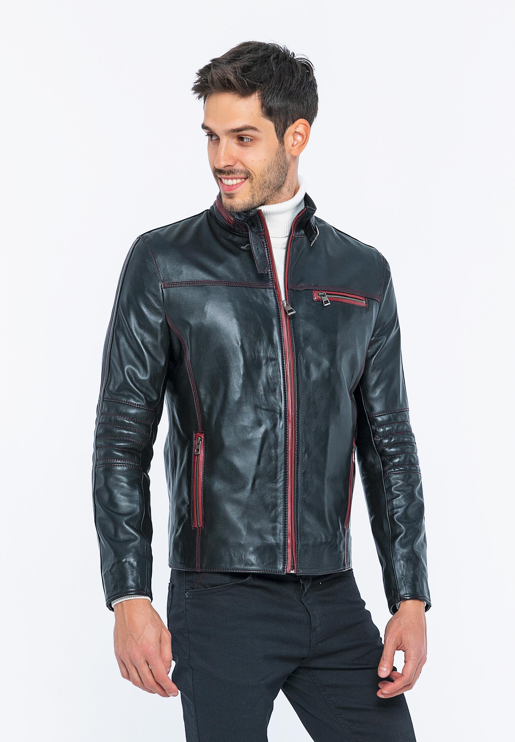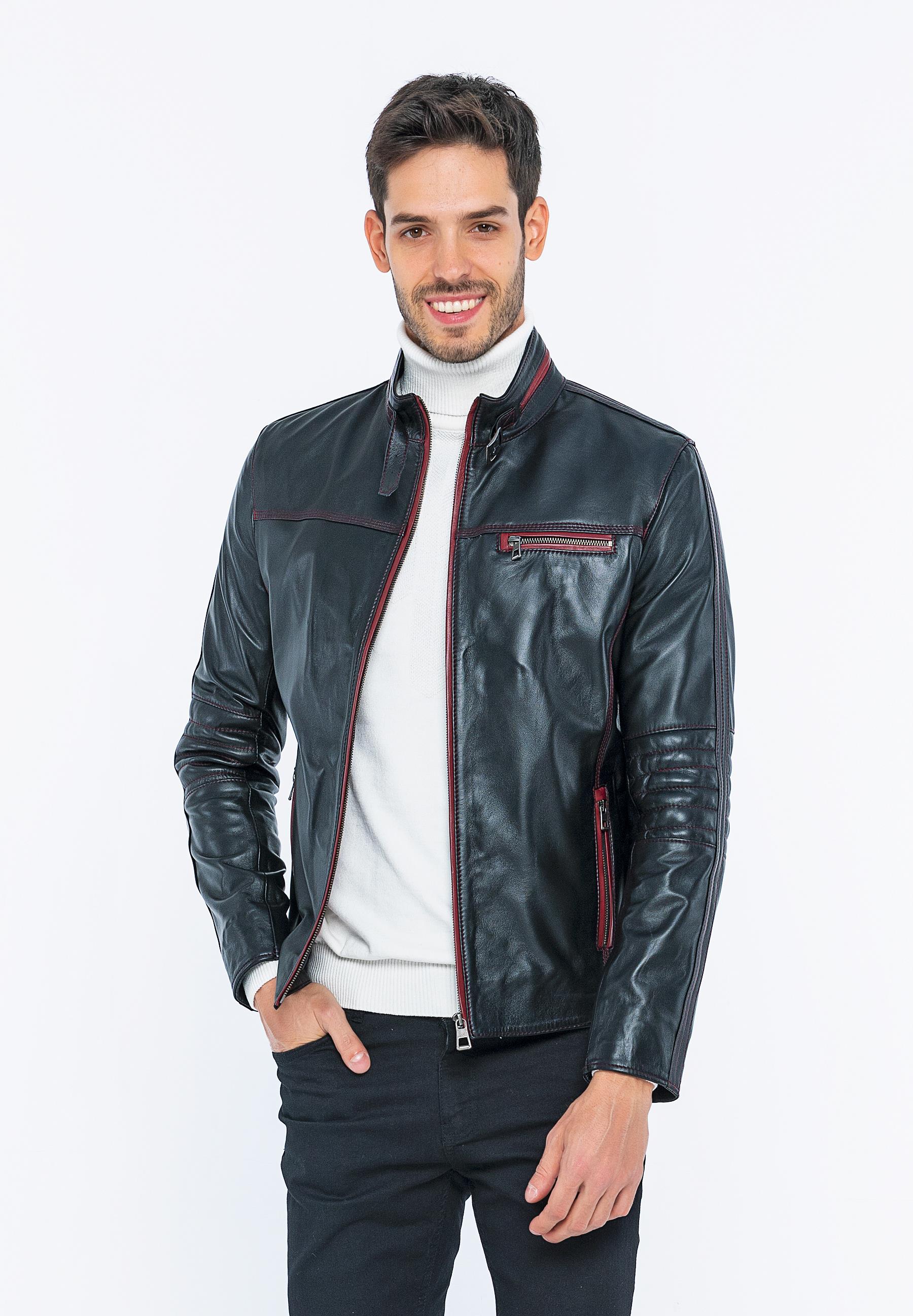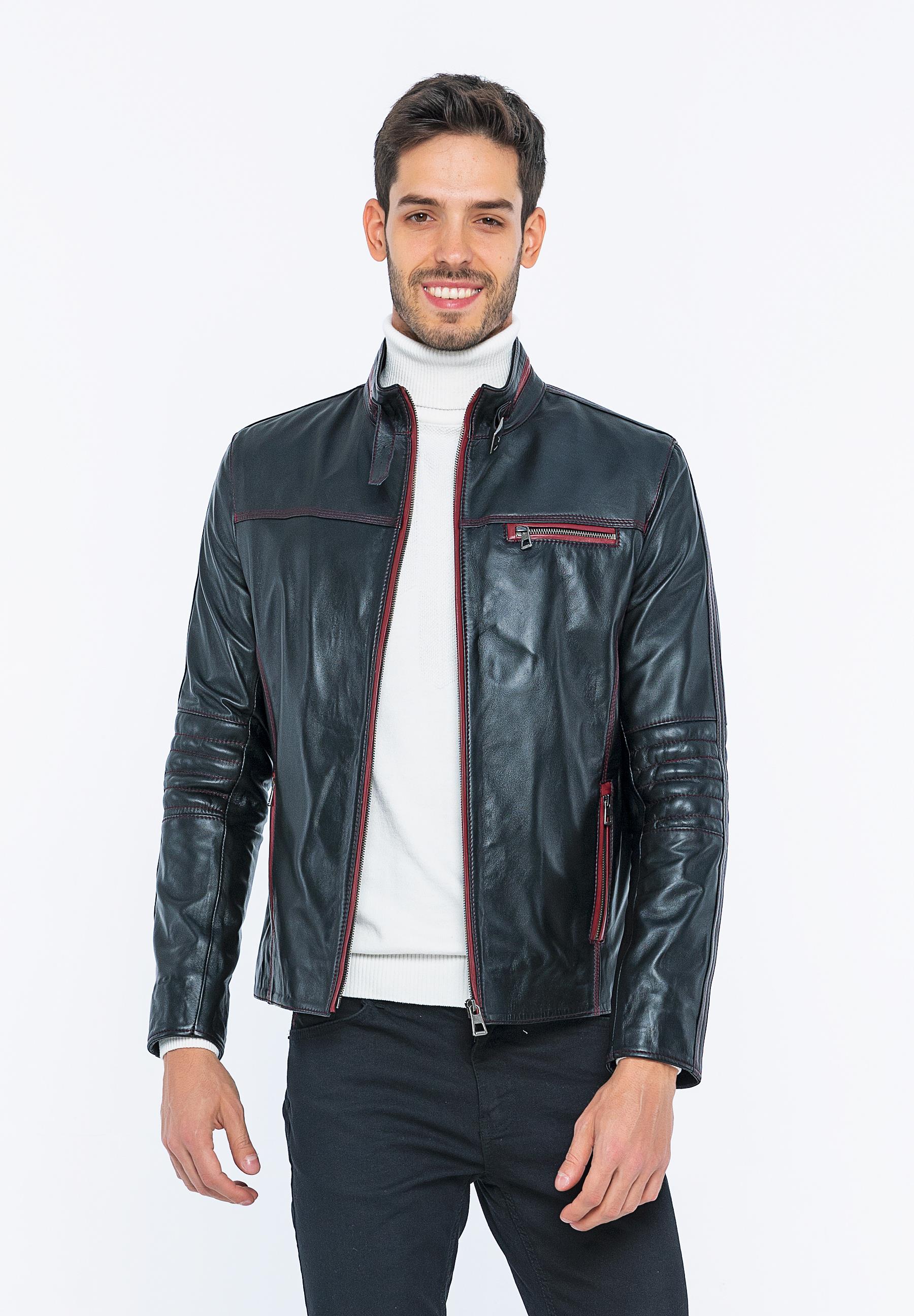 Outer fabric material: 100% leather Sleeve material: 100% leather Lining: 100% polyester Care instructions: Leather care materials should be used. Collar: Mandarin collar Connection: Zipper Pockets: Chest pocket, zippered pockets, inner pocket Pattern: Plain Fit: Normal Fit Shape: Flat Length: Normal Sleeve length: Long