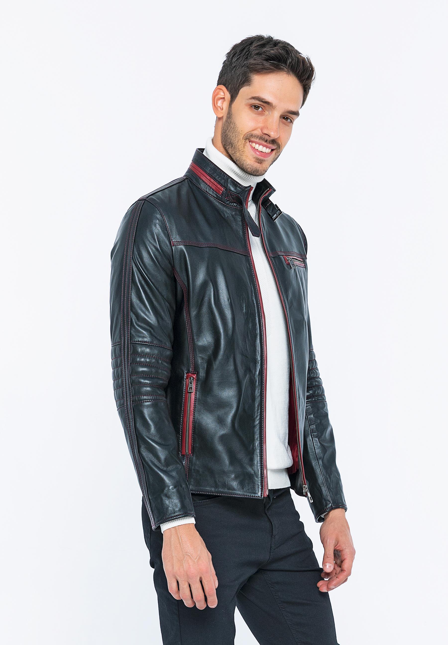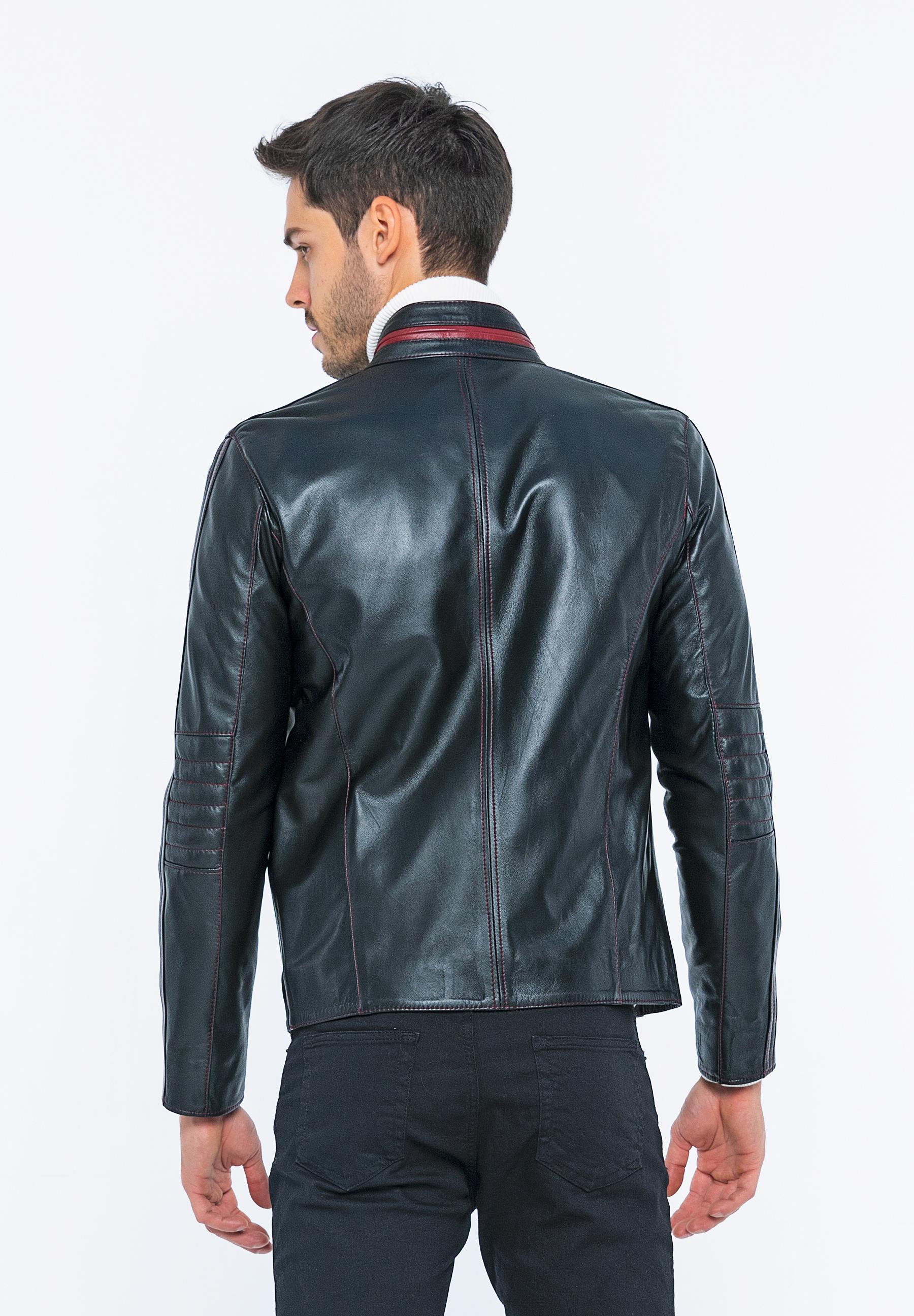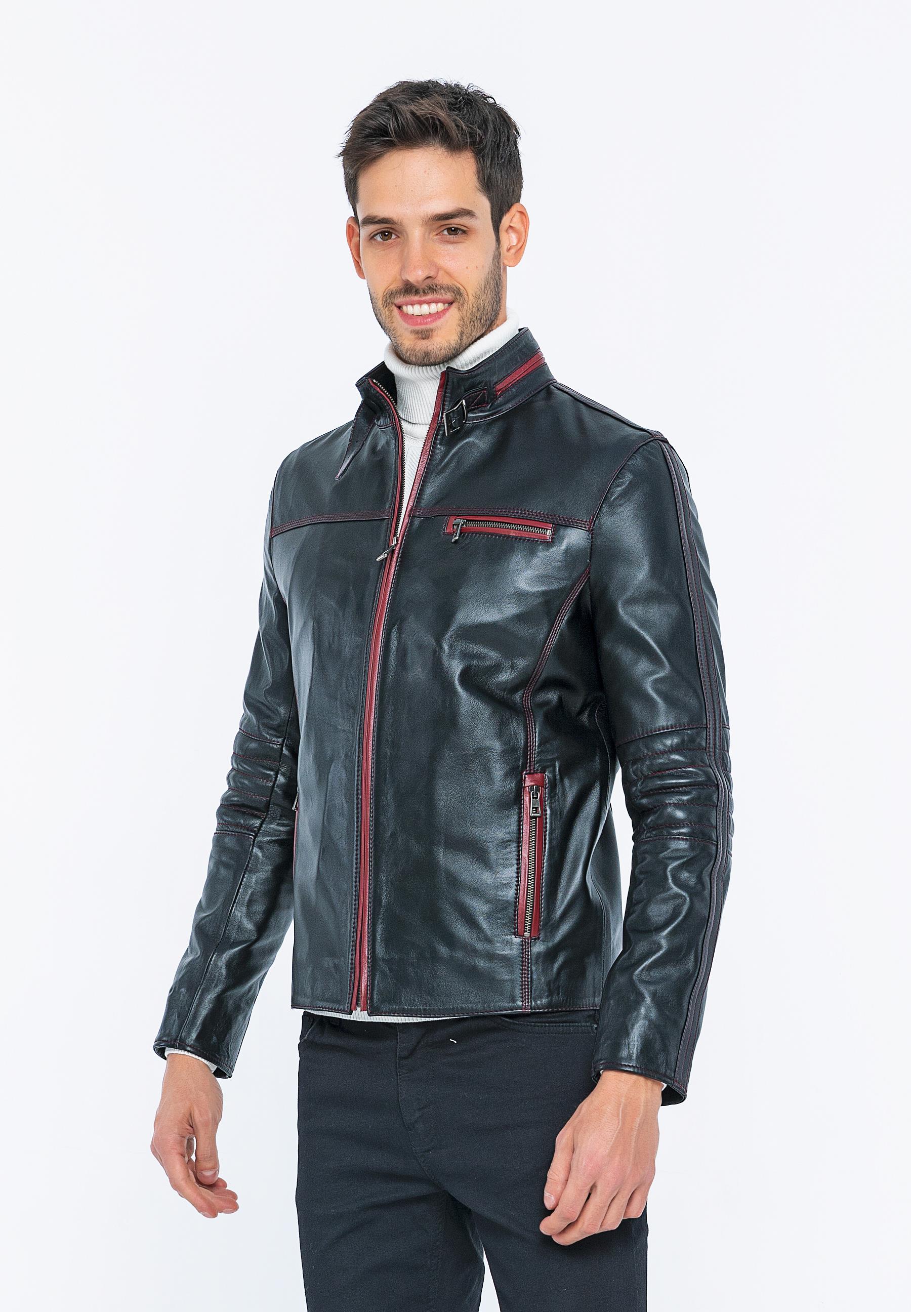 Outer fabric material: 100% leather Sleeve material: 100% leather Lining: 100% polyester Care instructions: Leather care materials should be used. Collar: Mandarin collar Connection: Zipper Pockets: Chest pocket, zippered pockets, inner pocket Pattern: Plain Fit: Normal Fit Shape: Flat Length: Normal Sleeve length: Long