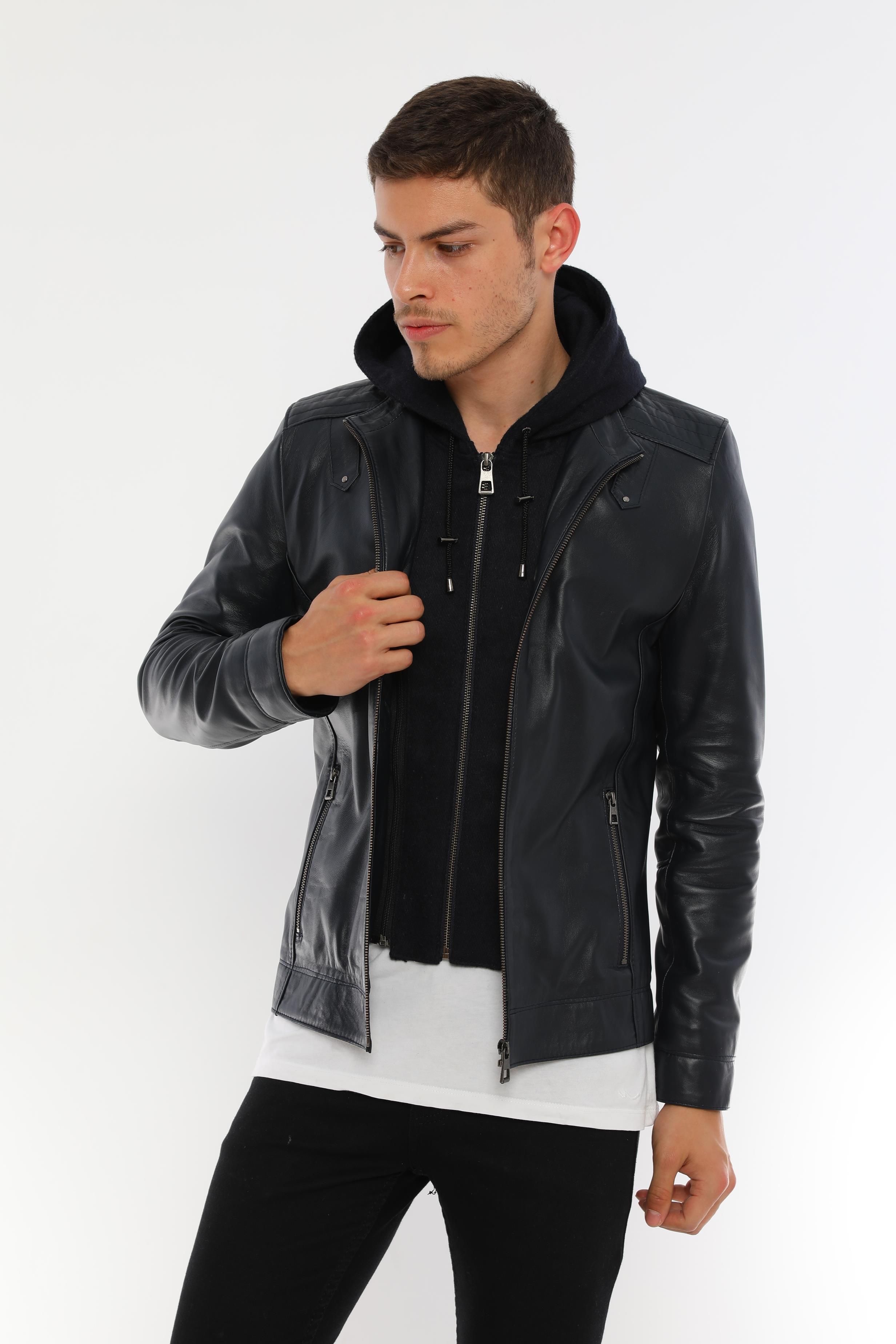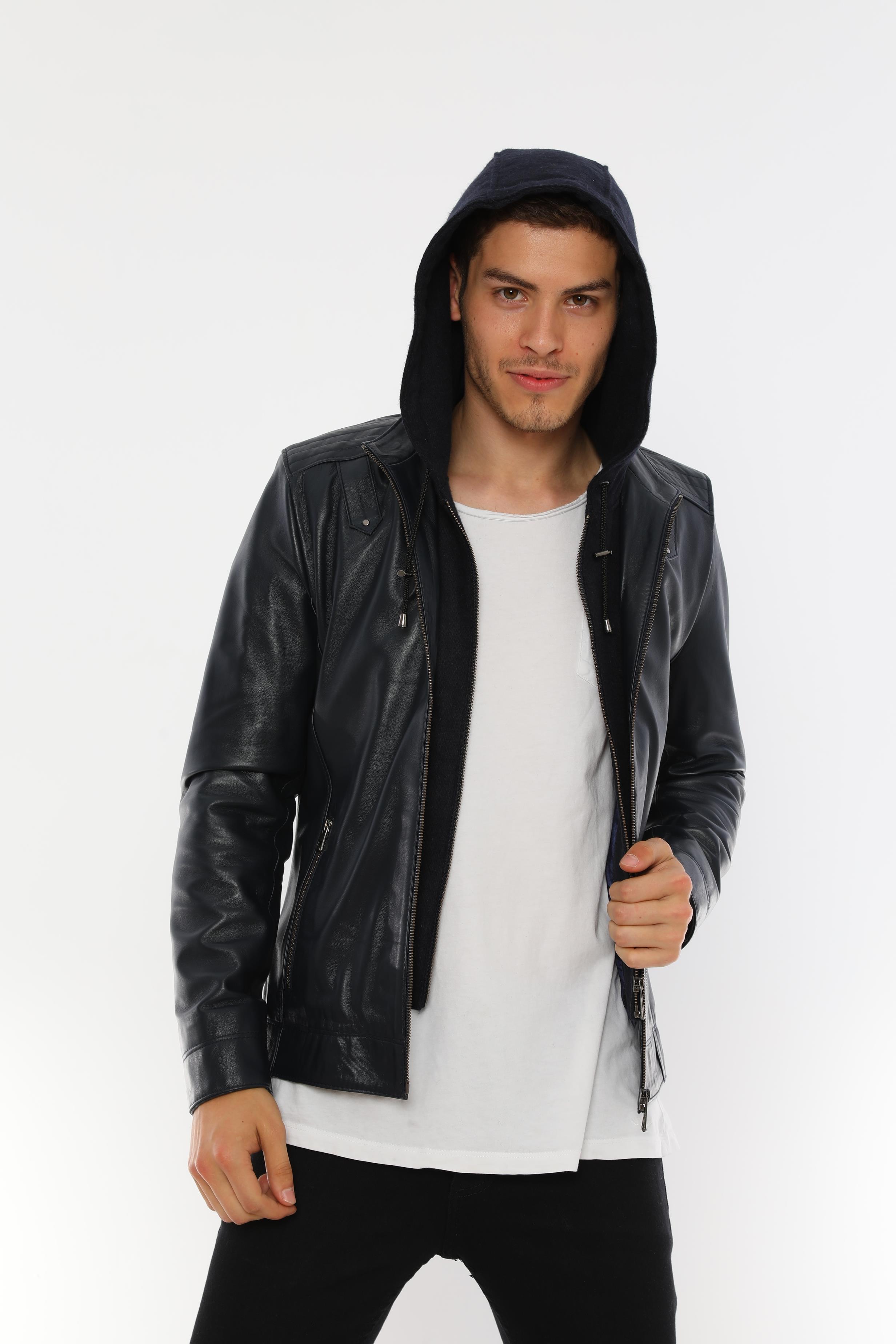 Basics&More Men Hooded Dark Blue Leather Jacket - E88K Basics&More Men Hooded Black Leather Jacket - E88K Basics&More Men Hooded Tea Leather Jacket - E88K Basics&More Men Hooded Chestnut Leather Jacket - E88K