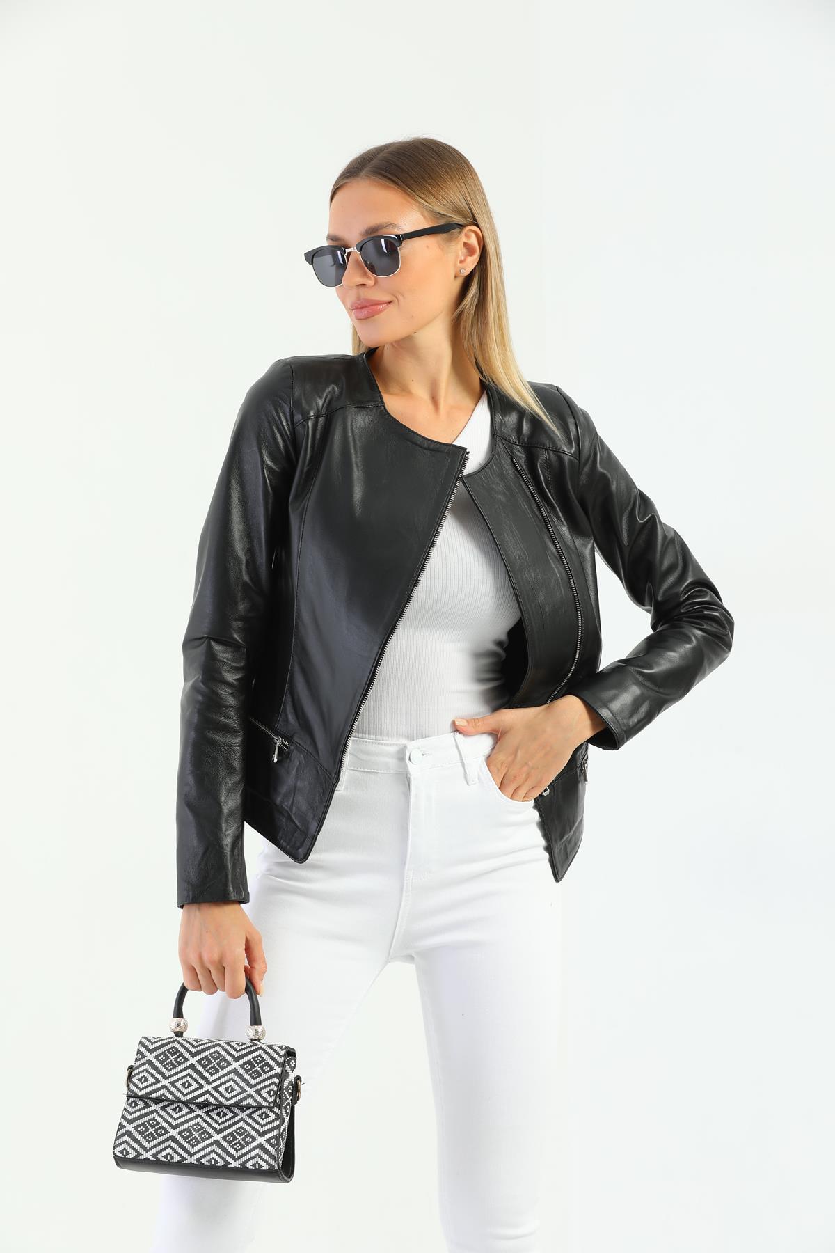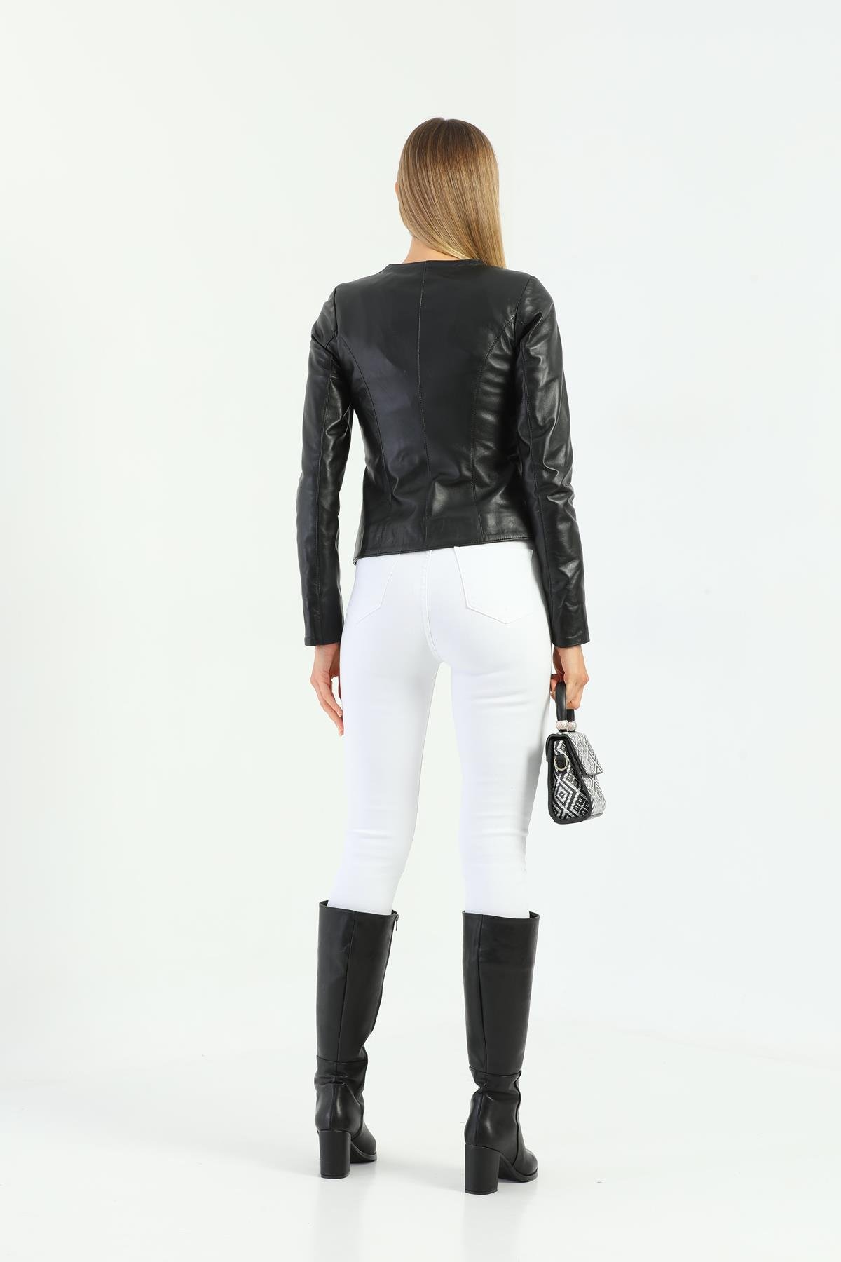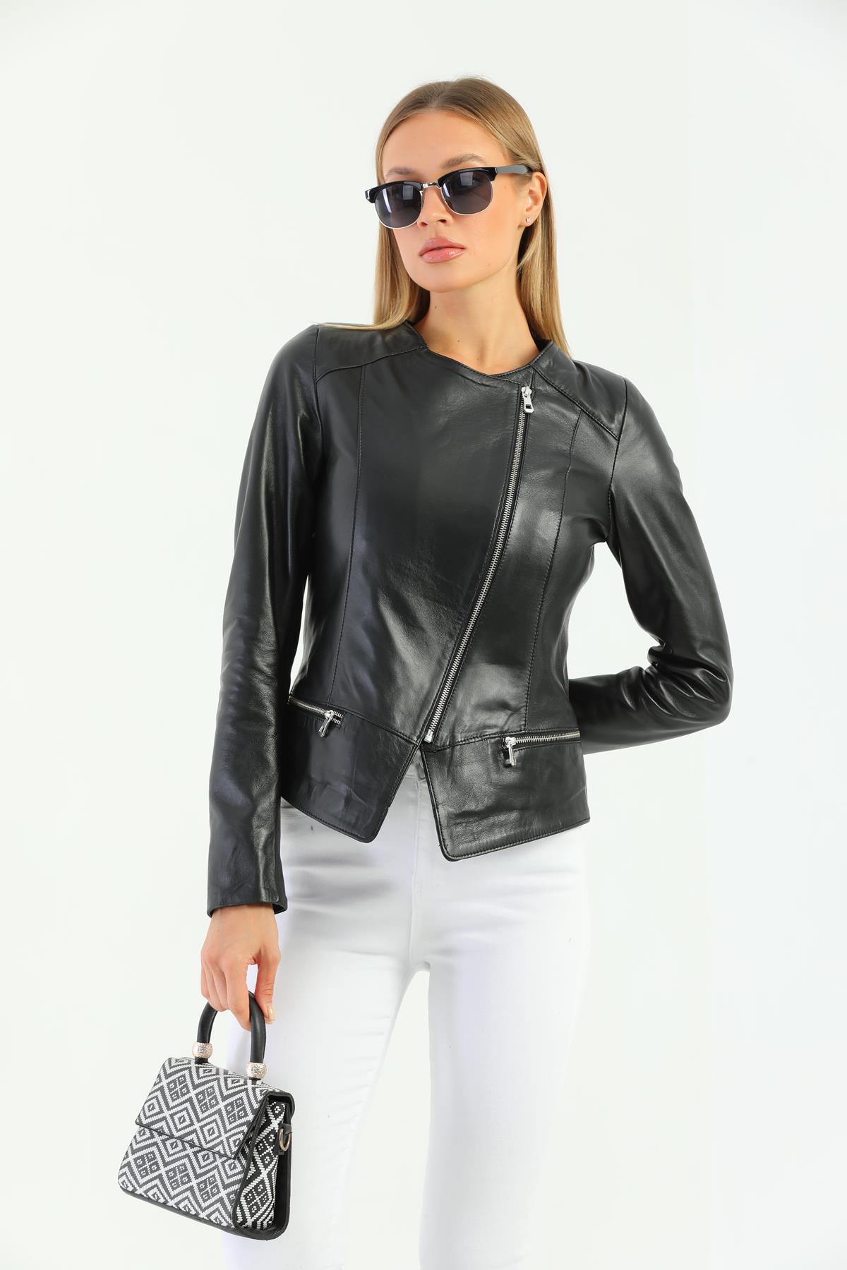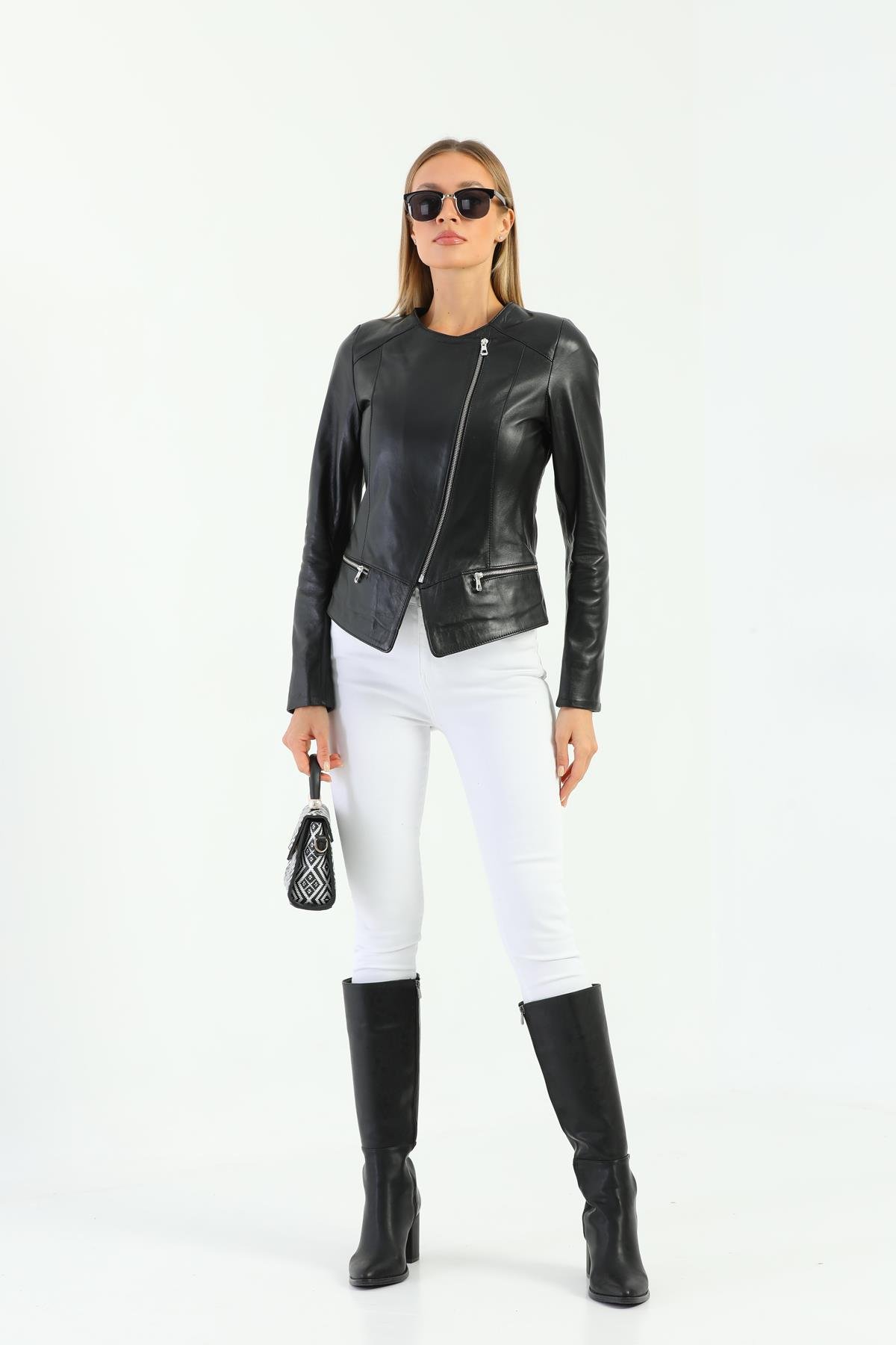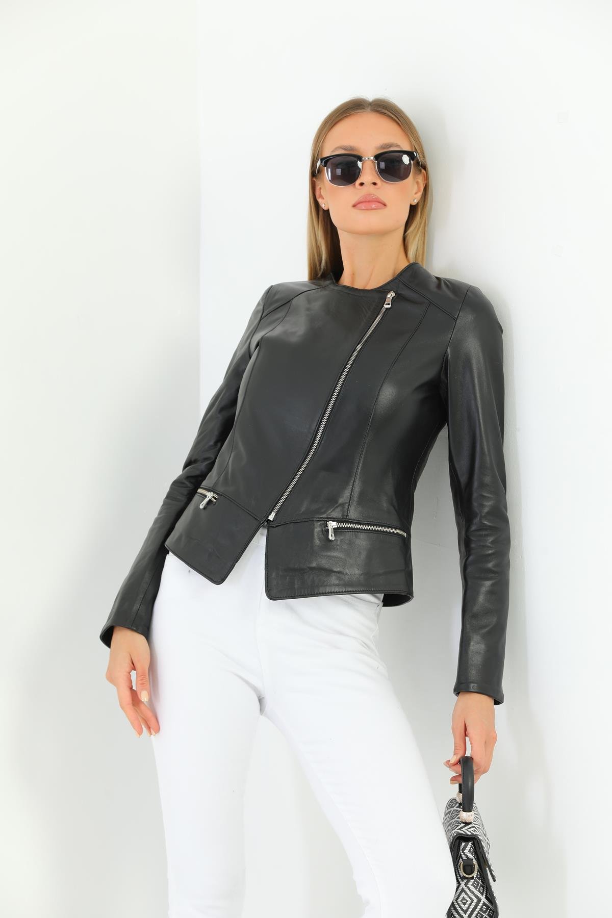This women's black leather jacket, which will add a sophisticated touch to your daily style, draws attention with its minimal lines and asymmetrical zipper details. With its high-quality leather material and exquisite craftsmanship, it combines both elegance and durability.