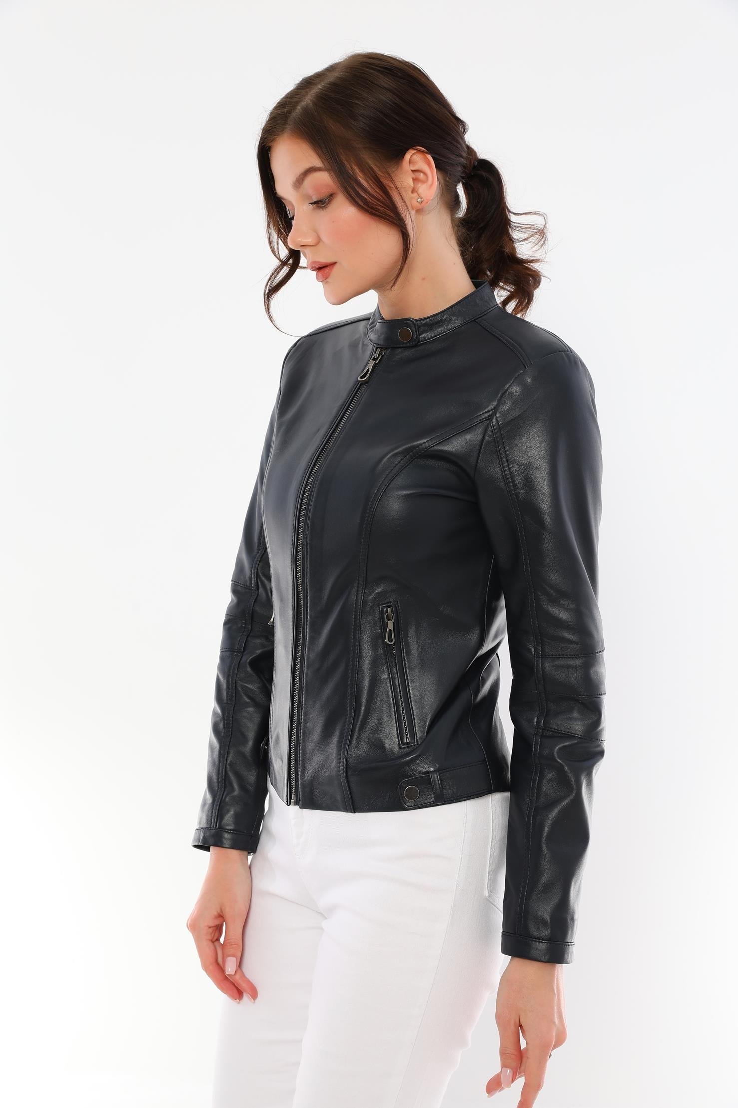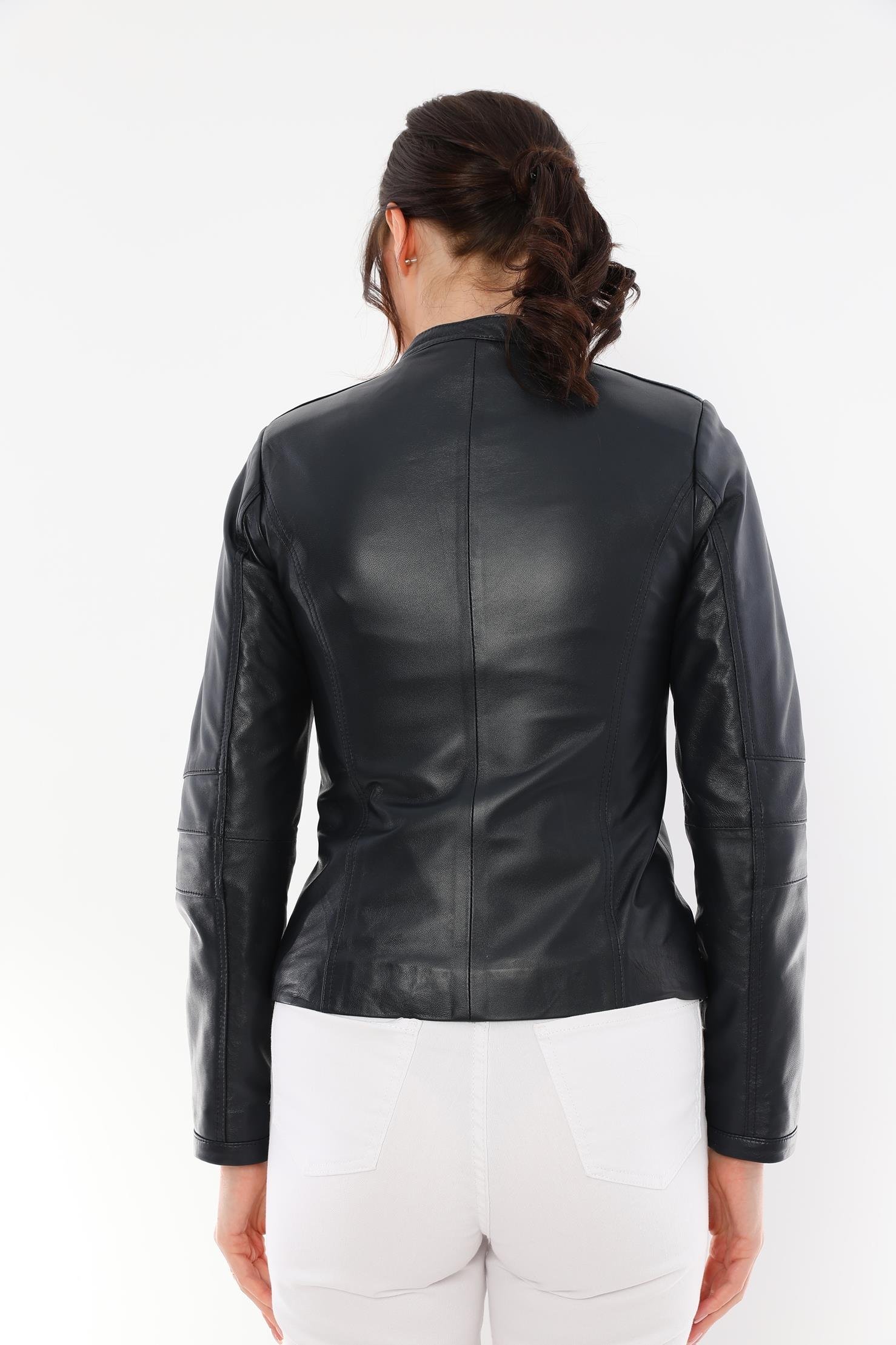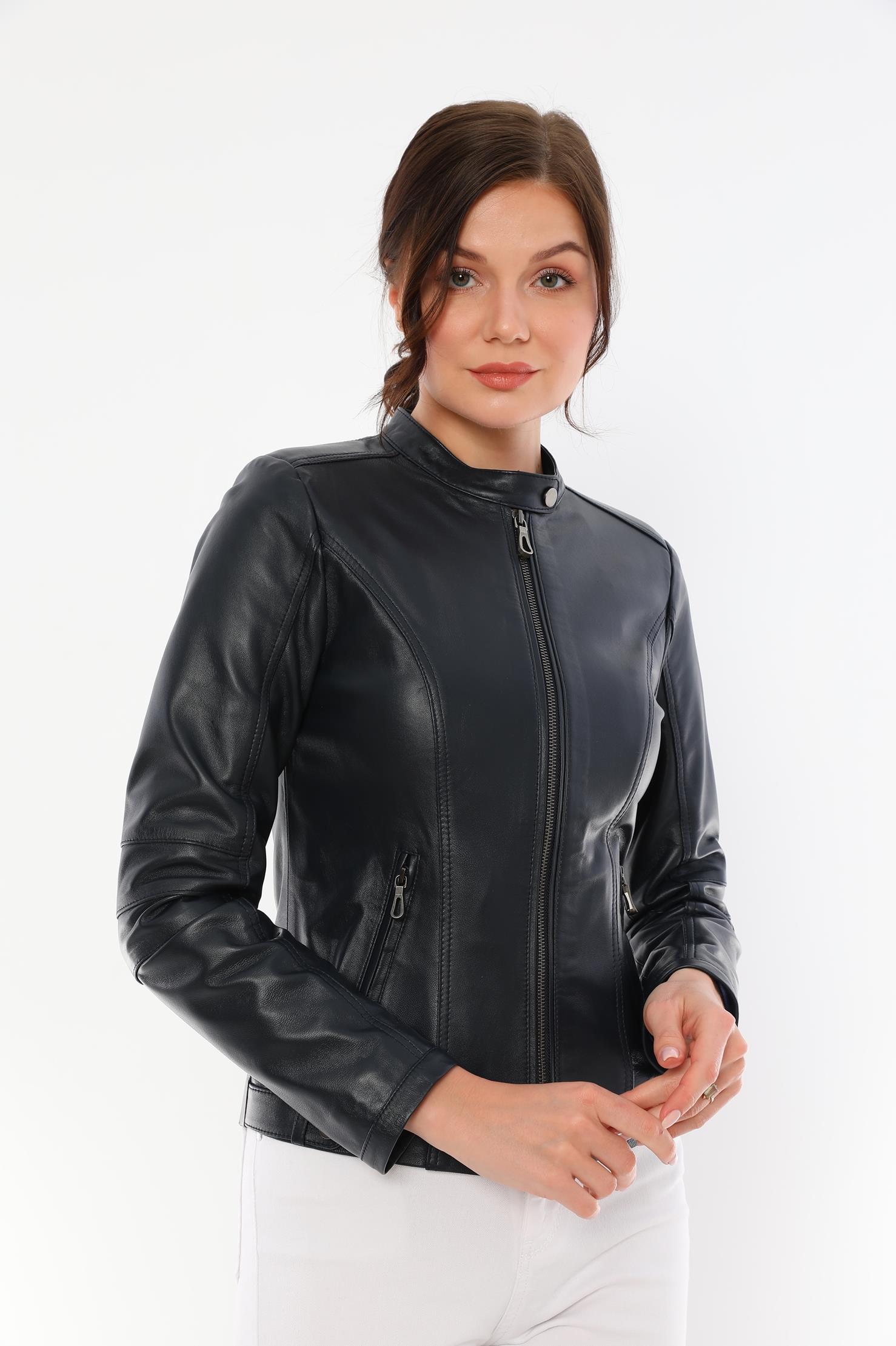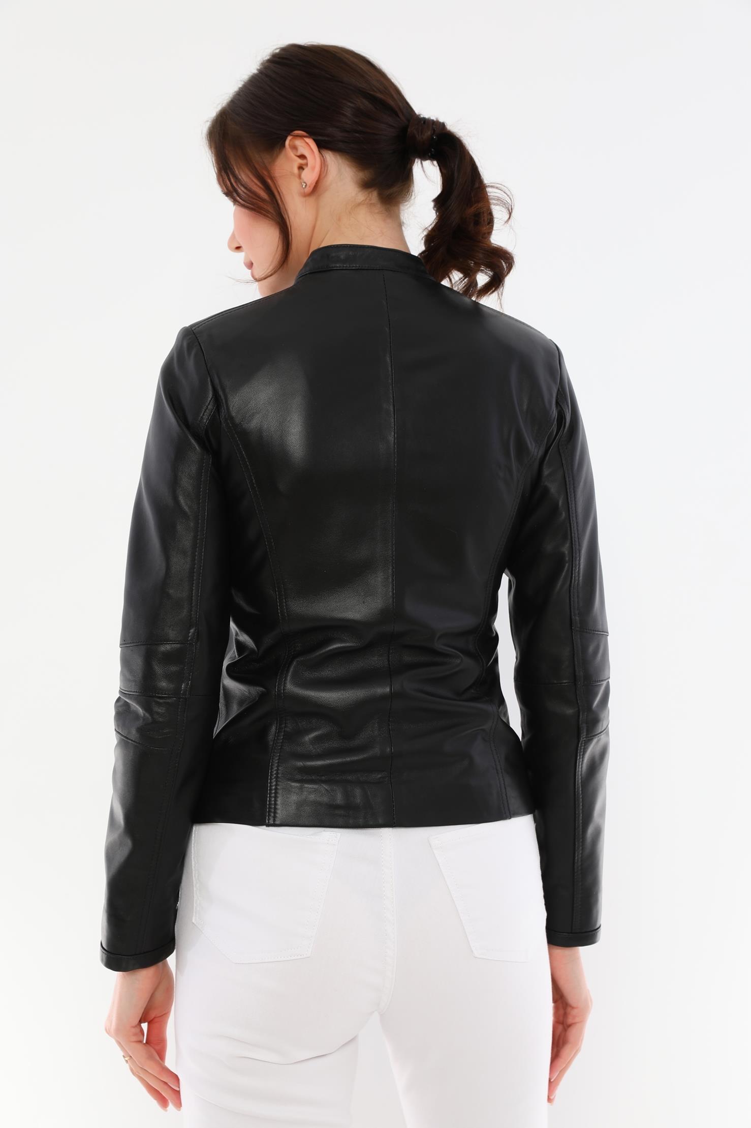 This women's black leather jacket, which will add an elegant touch to your style, offers both elegance and functionality together. It is made of quality genuine lambskin material and provides long-lasting use with its durability. This design with modern lines is an ideal choice for both your daily combinations and special events.