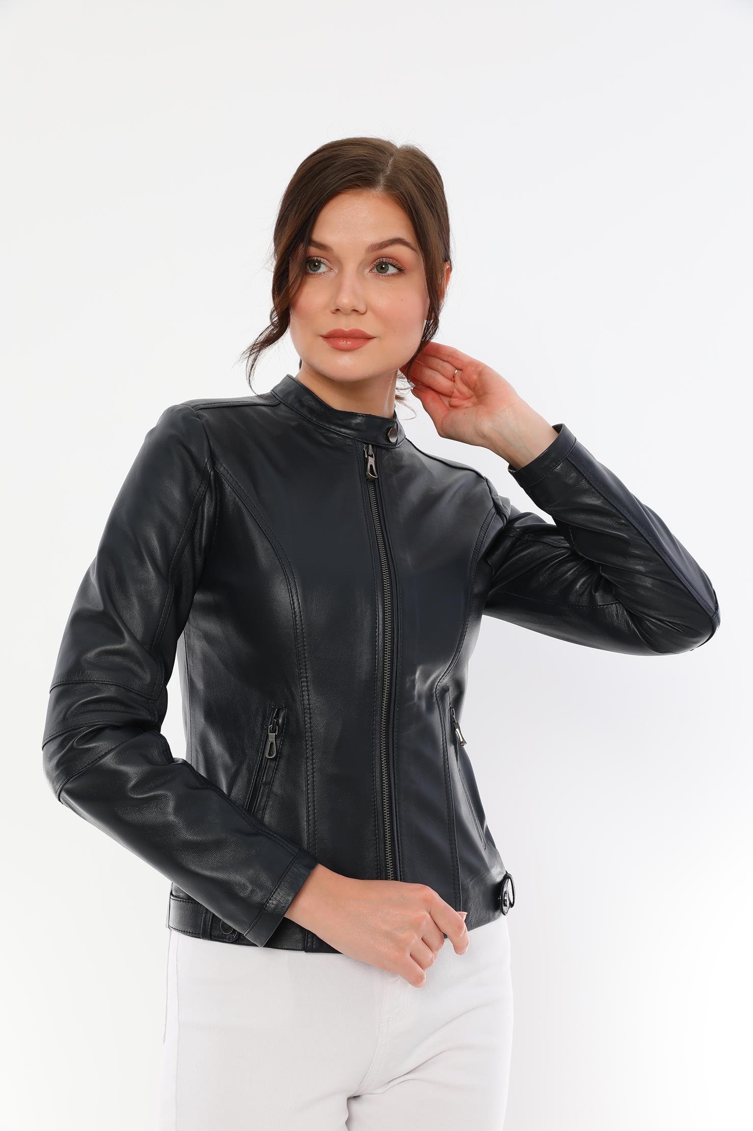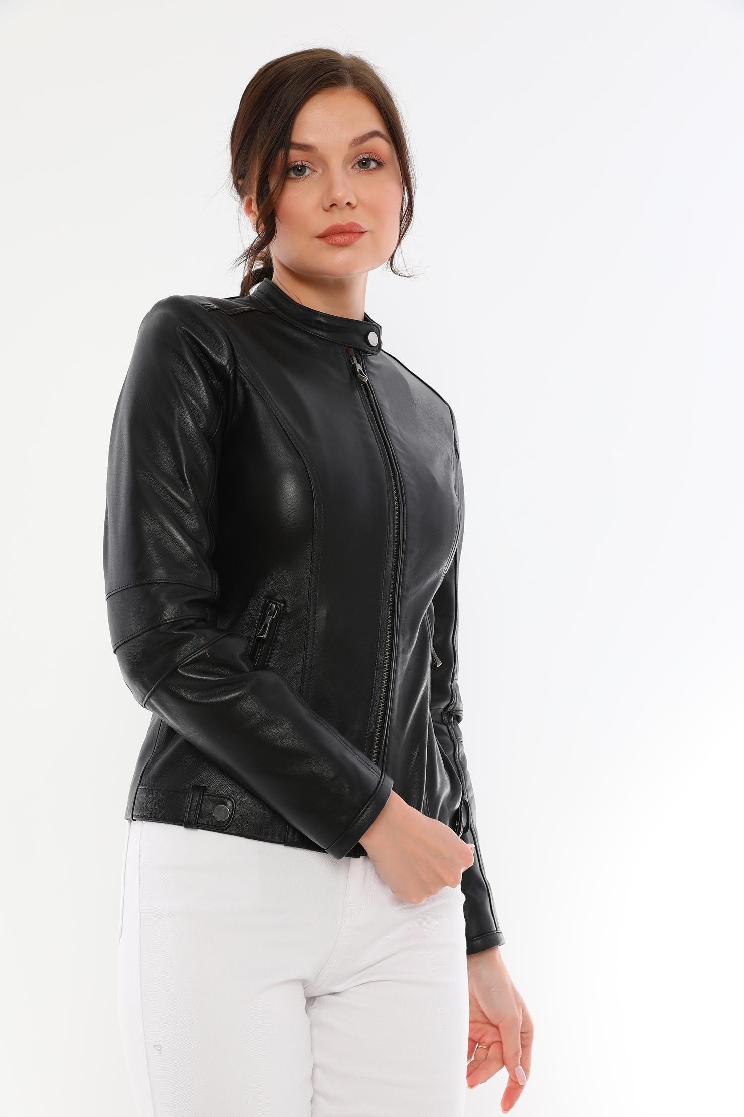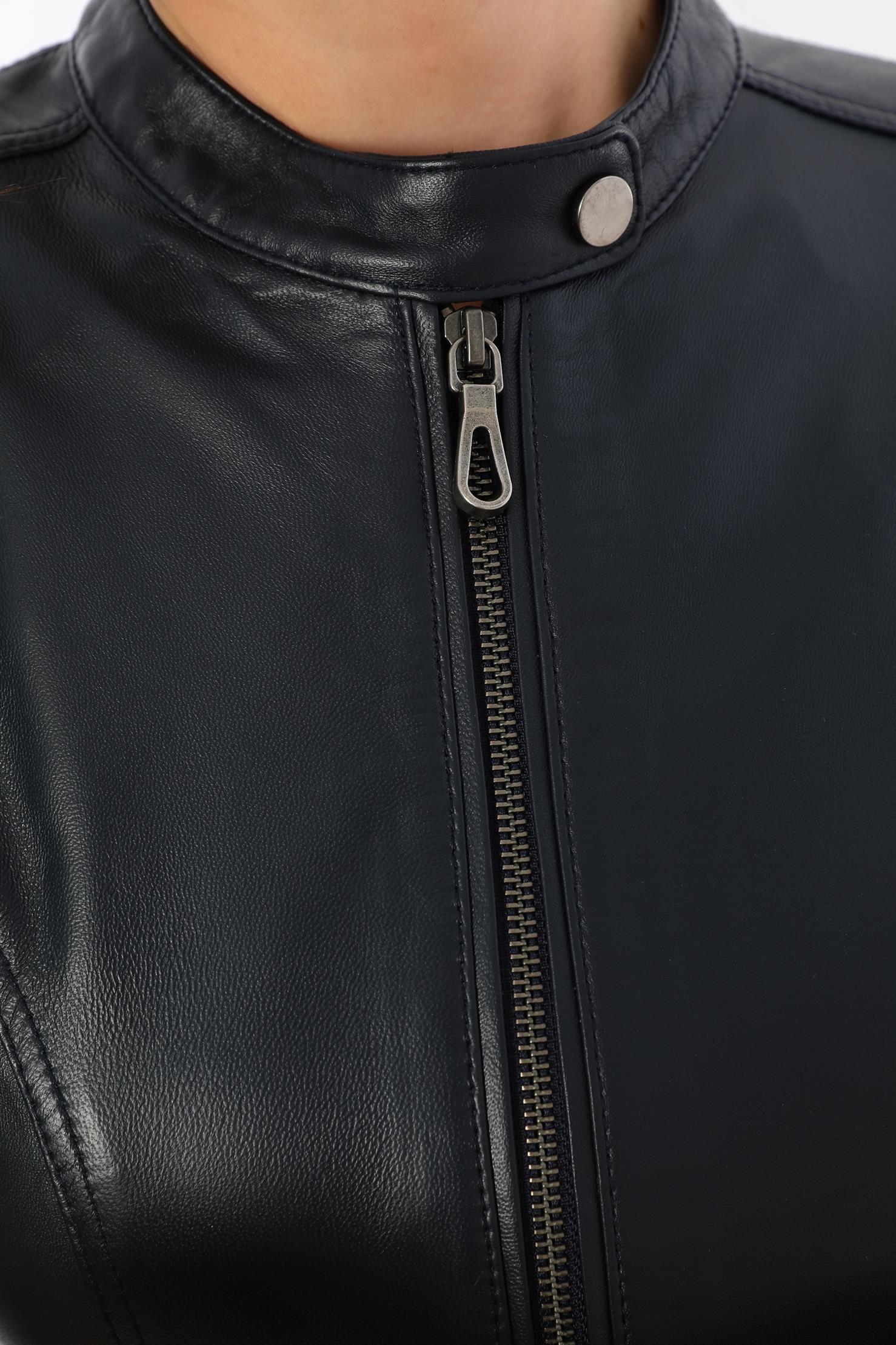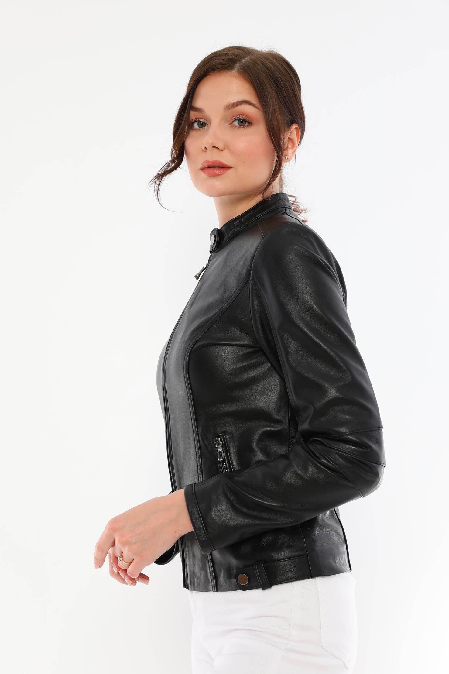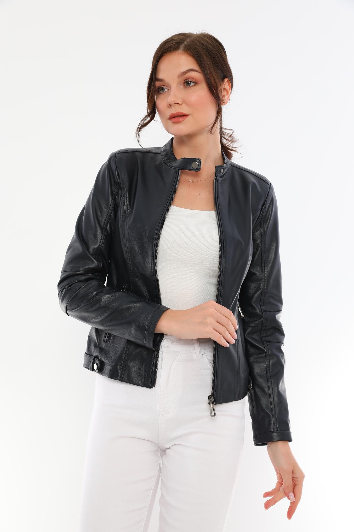 This women's black leather jacket, which will add an elegant touch to your style, offers both elegance and functionality together. It is made of quality genuine lambskin material and provides long-lasting use with its durability. This design with modern lines is an ideal choice for both your daily combinations and special events.