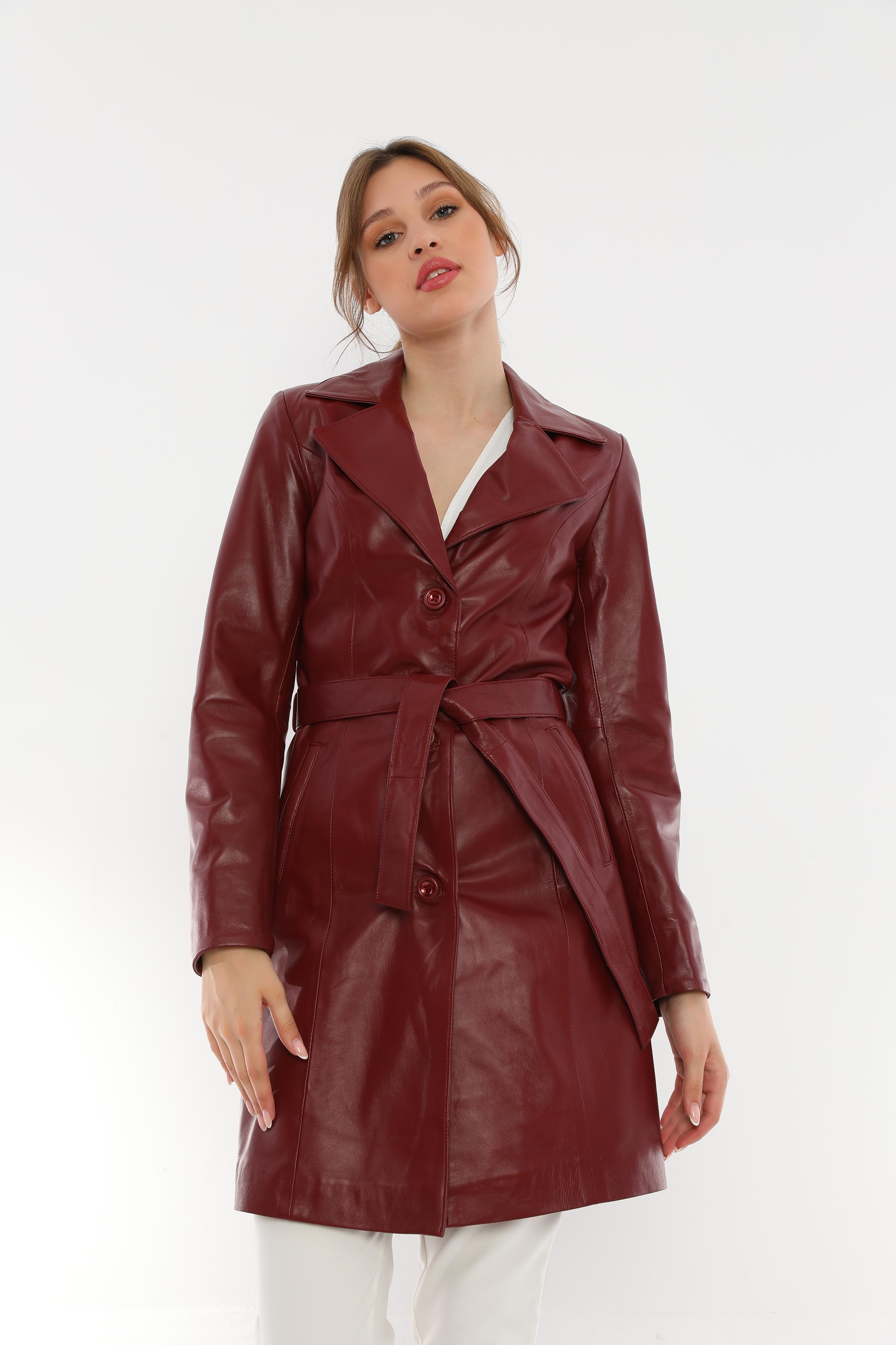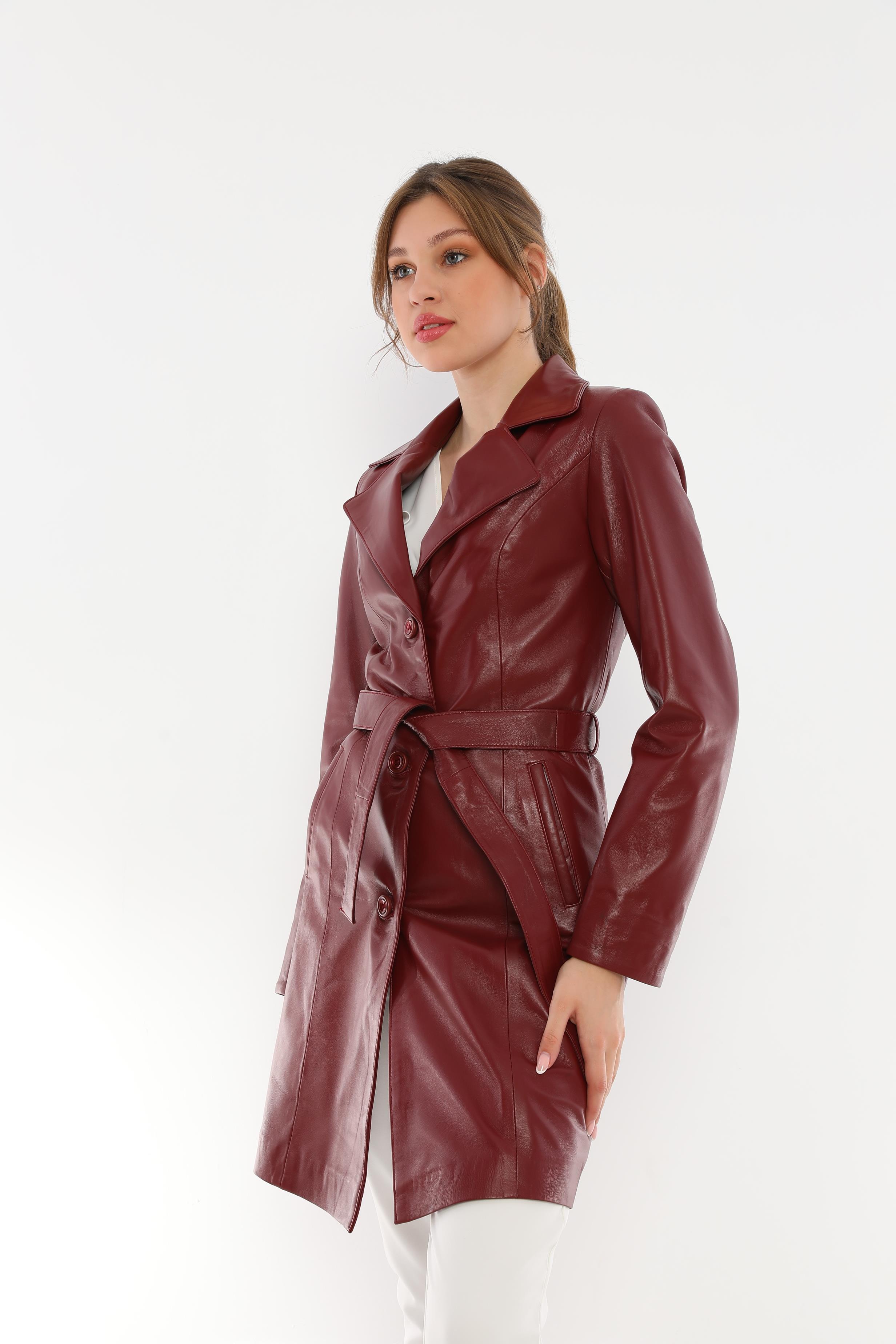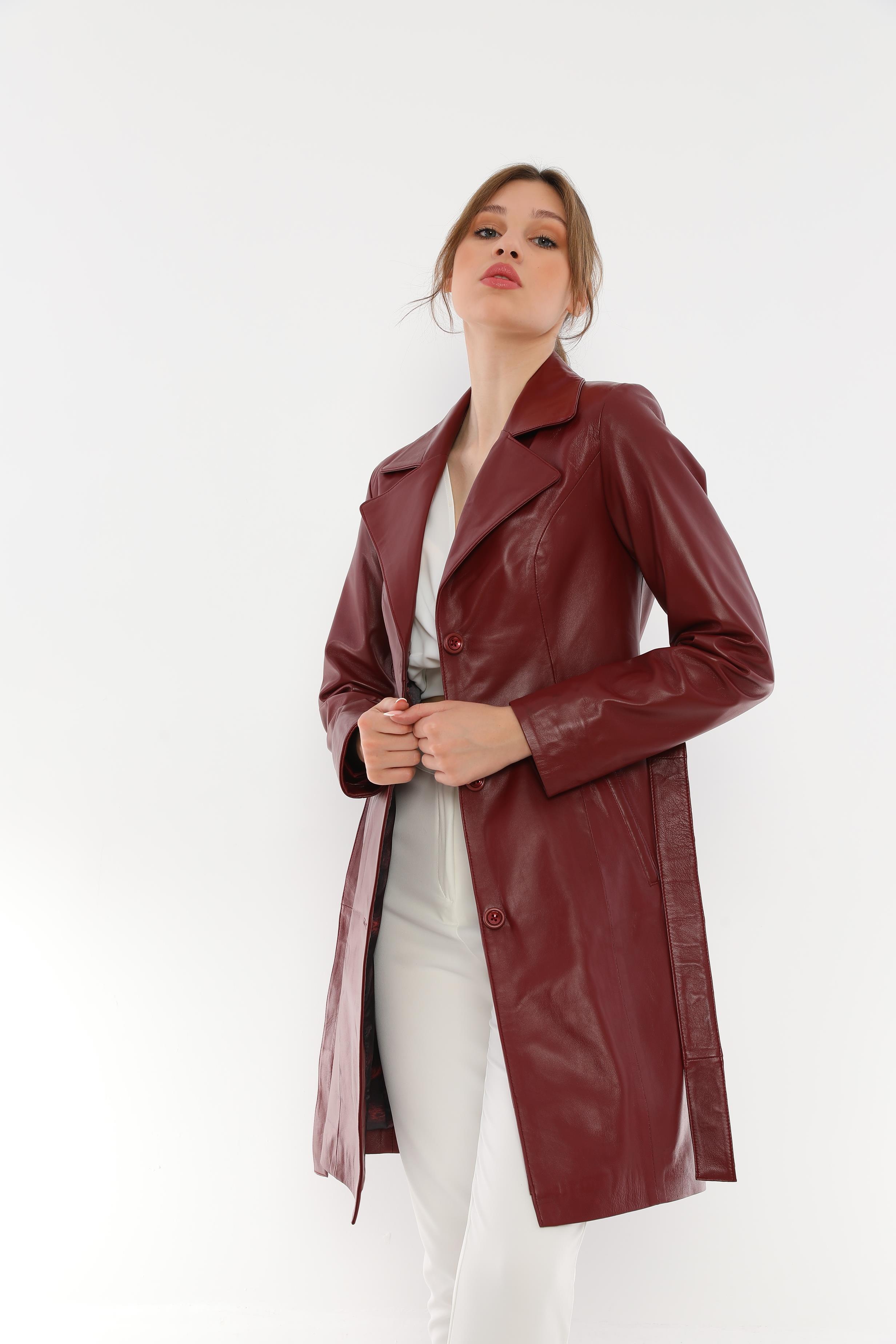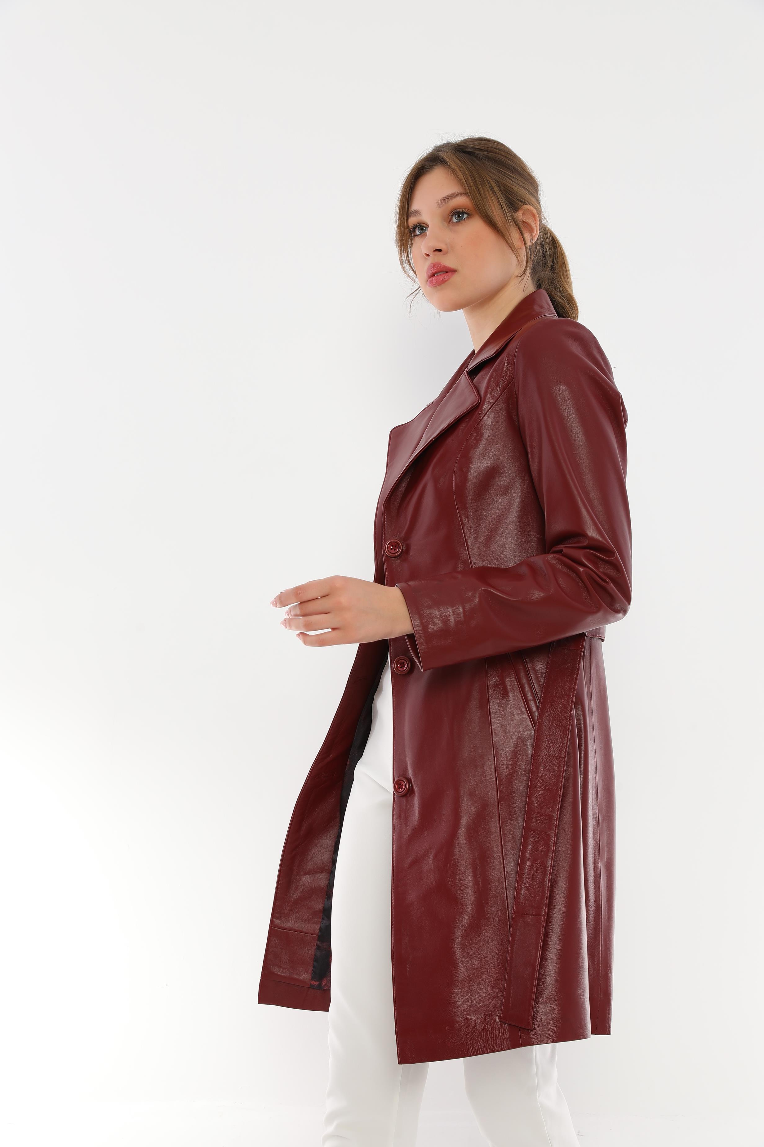 This sleek and modern burgundy belted leather trench coat combines elegance and comfort to make it a wardrobe staple.