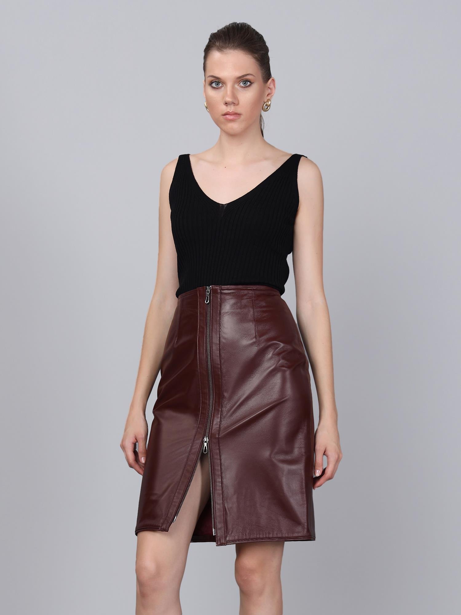 %100 Hakiki Deri: Doğal ve nefes alabilen yapısıyla konforlu bir kullanım sunar. Sentetik malzemelere kıyasla çok daha uzun ömürlüdür. Yüksek Bel Tasarım: Vücudu sıkı bir şekilde sararak ince bir siluet oluşturur. Bel bölgesini daha ince gösterirken bacak boyunu uzun gösteren bir illüzyon yaratır. Tam Boy Fermuar Detayı: Önden aşağıya kadar uzanan metal fermuar, eteğe modern ve dinamik bir hava katarken, kullanım kolaylığı da sağlar. İstenildiğinde fermuar açıklığı ayarlanarak hareket özgürlüğü sağlanabilir. Şık ve Feminen Kesim: Diz hizasında biten kalem formu, hem resmi hem de gündelik kombinlere uyum sağlar. Canlı Renkler: Cesur ve dikkat çekici tonlar ile kombinlerinize hareket katabilir. Günlük, ofis veya özel davetlerde çarpıcı bir görünüm elde etmenizi sağlar. ✅ Dayanıklı ve Kaliteli İşçilik: Gerçek derinin sunduğu dayanıklılık sayesinde yıllarca kullanılabilir, şekli bozulmaz ve zamansız bir moda parçası olarak gardırobunuzda kalır.