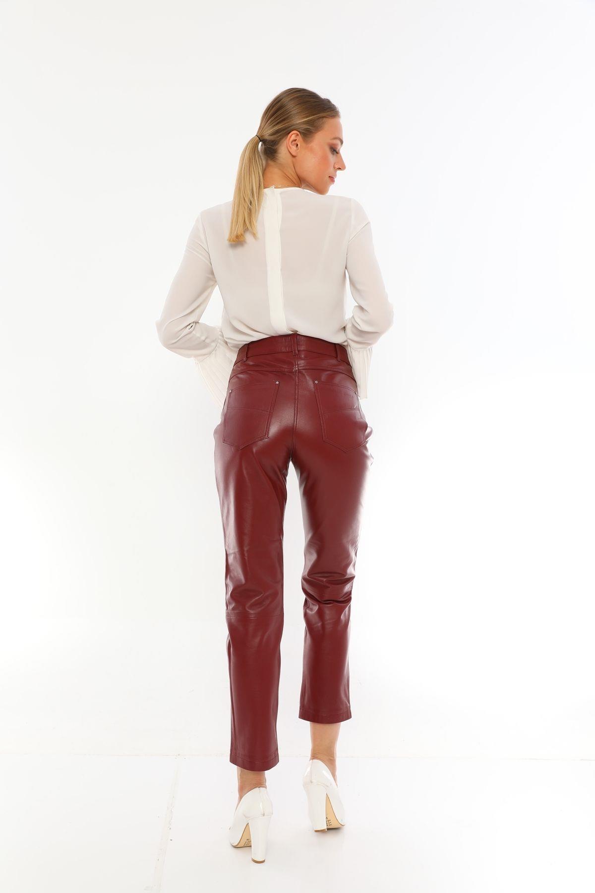 These Women Five Pocket Leather Trousers stand out for their sleek and modern design. Thanks to its high waist cut, it creates a feminine silhouette by elegantly hugging the body lines. The slim-leg design adds a modern twist to the classic Trousers look, while the ankle-length cut makes the legs look longer than they are. The genuine leather material stands out for its durability and quality; It makes you feel the feeling of luxury at every step. Its five-pocket structure is both a functional and aesthetic detail; Ideal for everyday use. It can be easily combined with its plain pattern and appeals to all age groups. While it offers a comfortable use with its lined structure, its slim fit pattern ensures that it is body-hugging. Made of 100% genuine leather, these Trousers maintain their form even with long-term use;