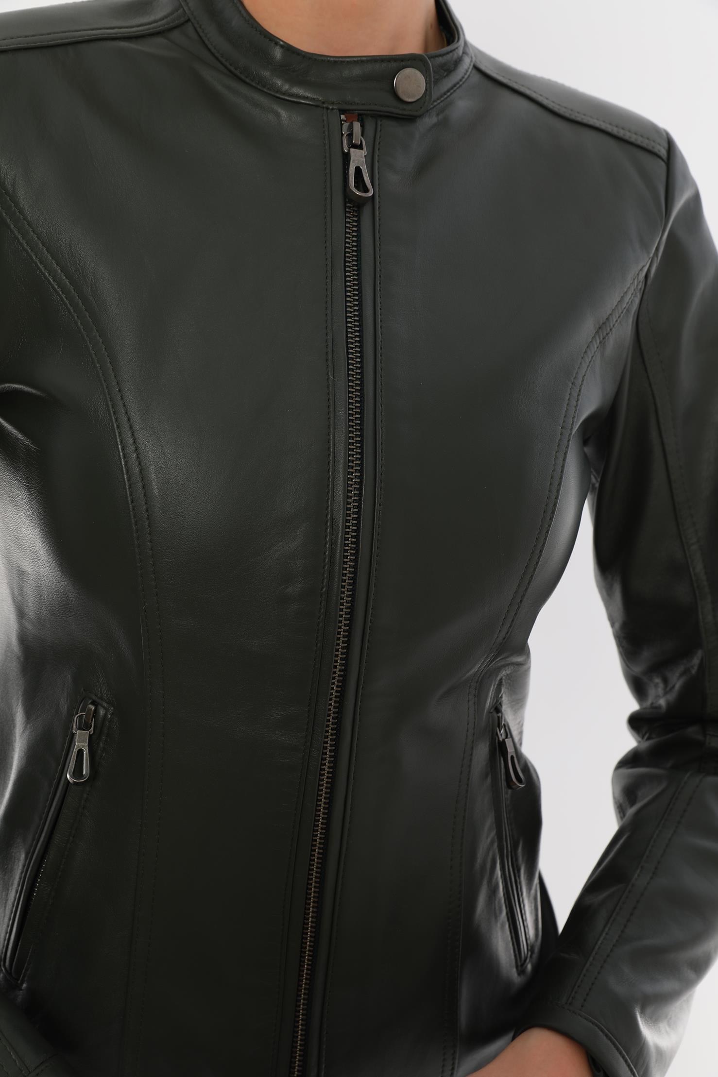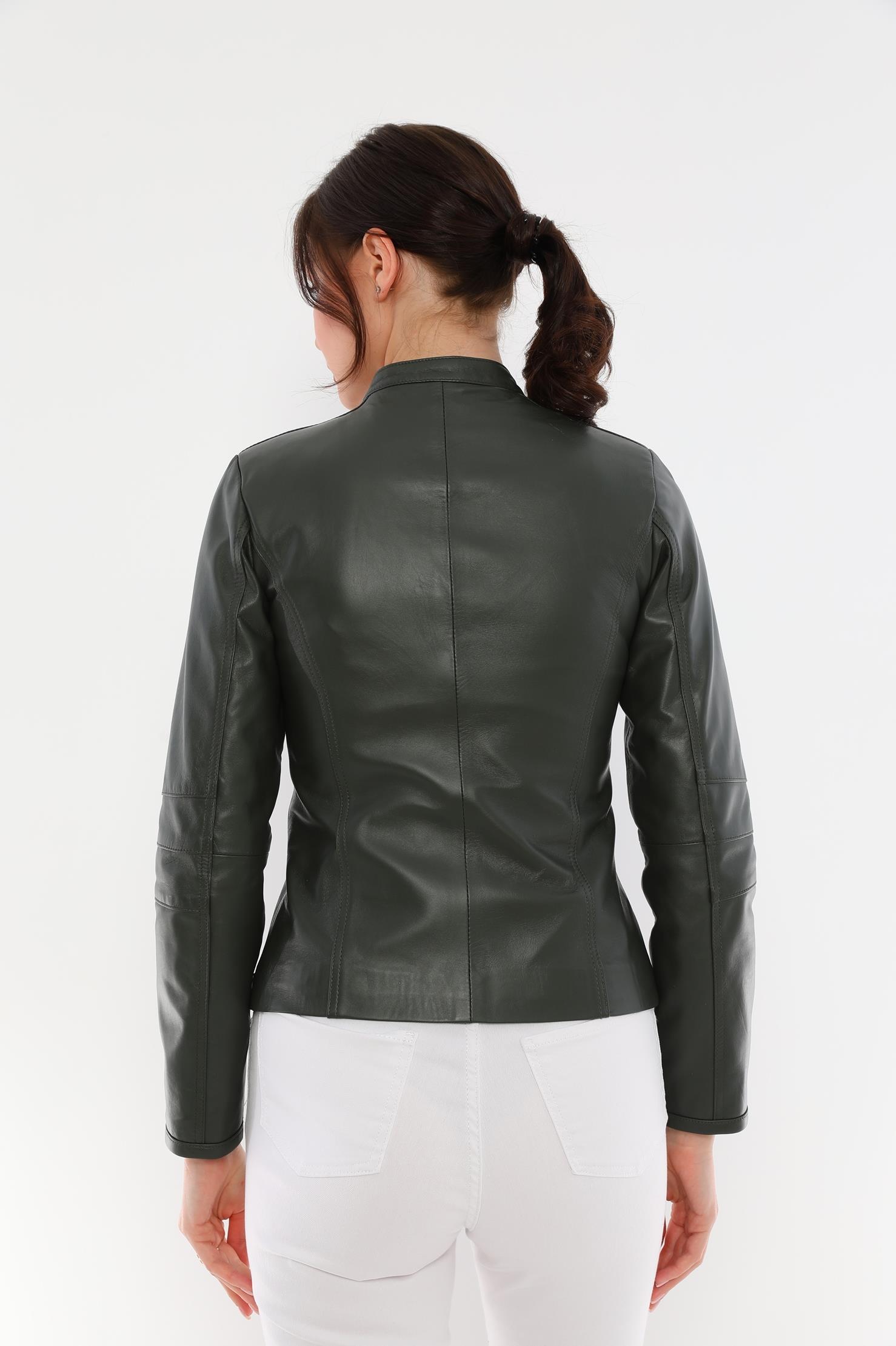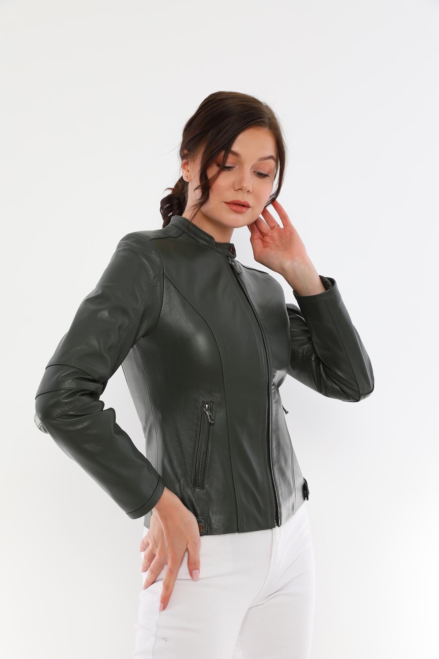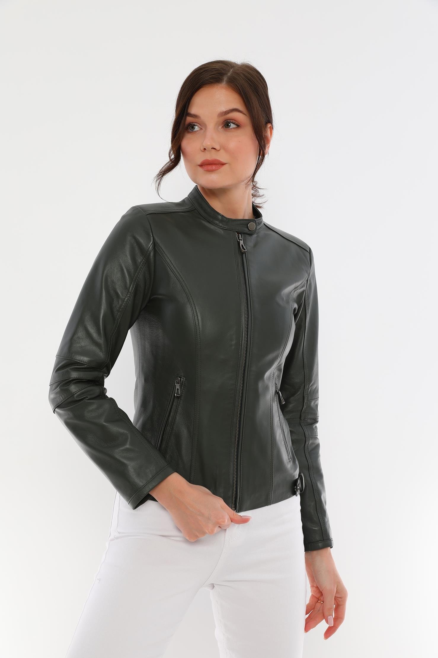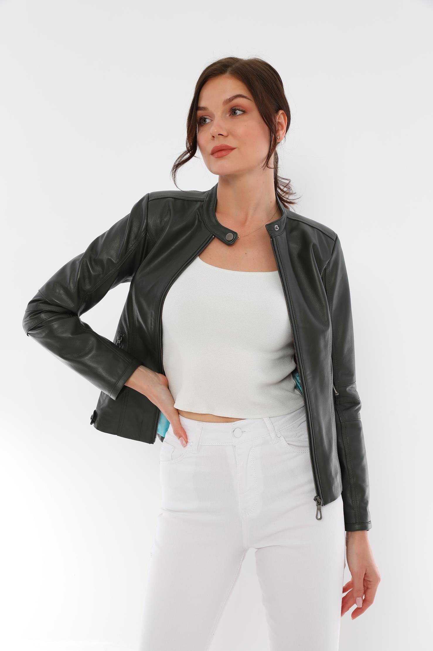 This women's green leather jacket, which will add an elegant touch to your style, offers both elegance and functionality together. It is made of quality genuine lambskin material and provides long-lasting use with its durability. This design with modern lines is an ideal choice for both your daily combinations and special events.
